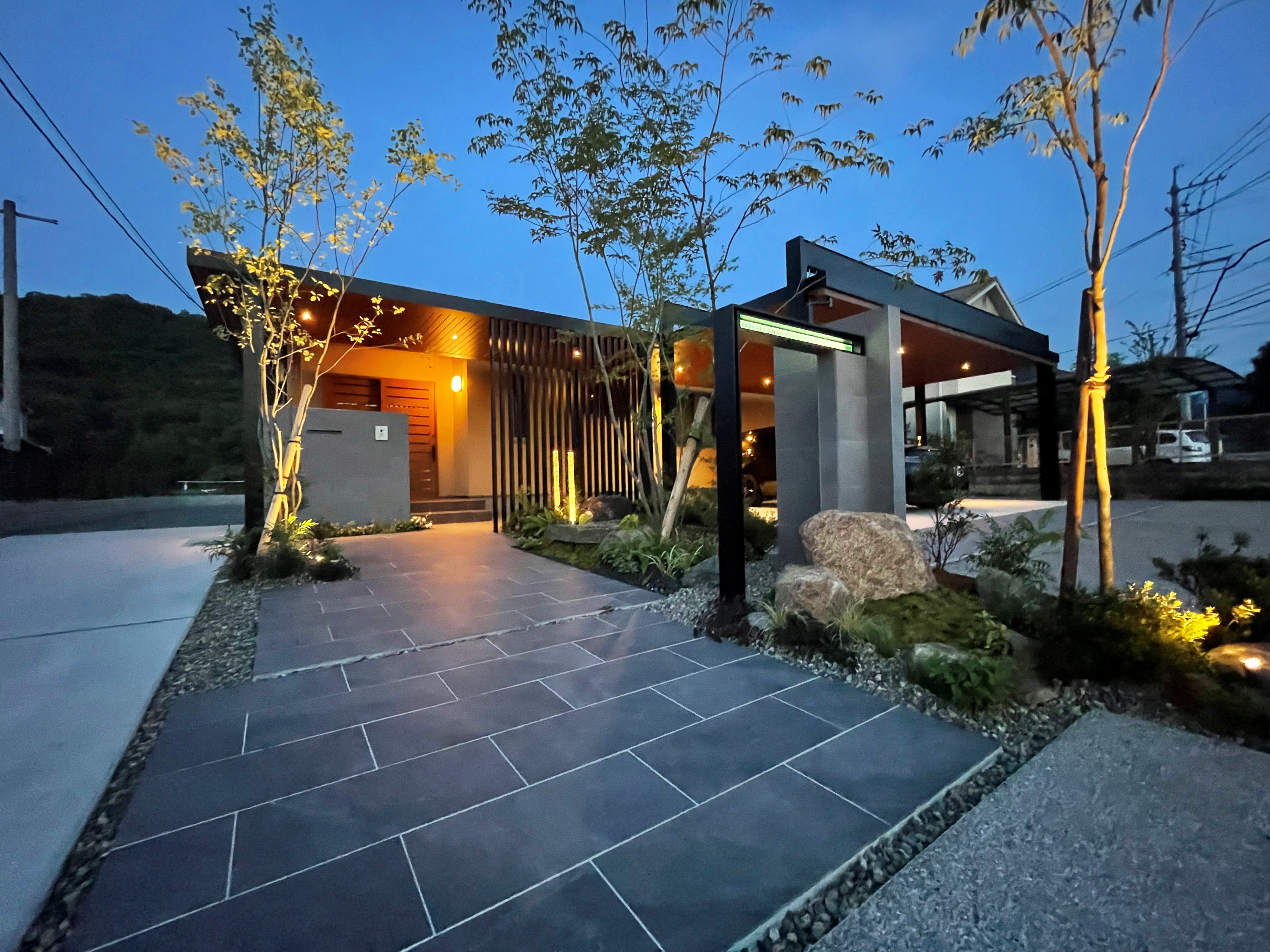 アプローチまでつながったスタイリッシュなカーポート広島市エクステリア・外構モダンハウジング。