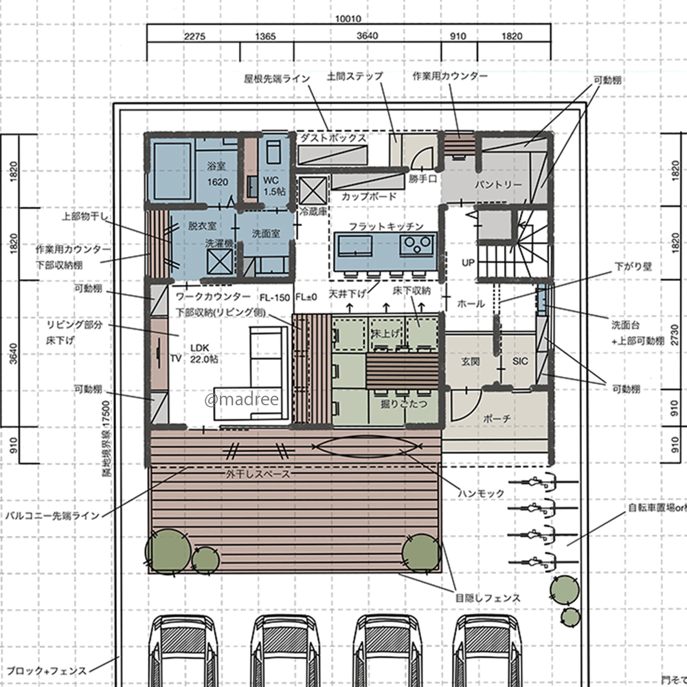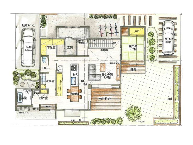 間取り平屋平面図日本庭園縁側ウッドデッキ庭デザイン外構デザイン畳コーナー二間続き和室和室和モダン庭付の家シューズクローク建築学生手描き図面。