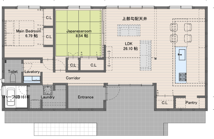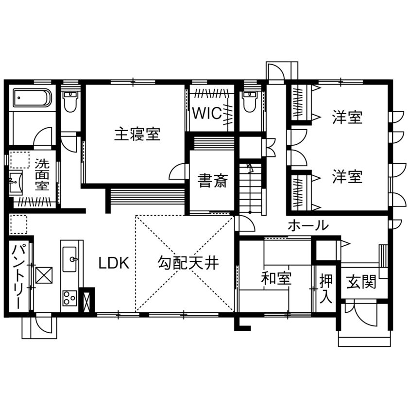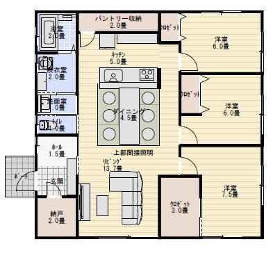 和モダンダイニングの平屋の間取り例平屋間取り。