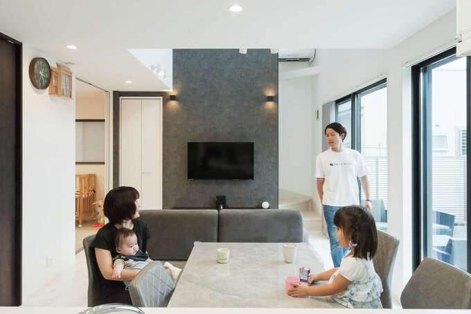 Iさん家族のリビングダイニング。階段下を活用してテレビの裏に収納を設け、レコーダーなどの機器をまとめて置けるようにした くふうイエタテ。