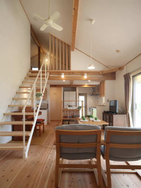 勾配天井の吹き抜けにして解放感たっぷり!階段で上る小屋裏も色んな使い方ができるLDK -事例写真「~平屋~杉いっぱいのここちいい家」注文住宅のハウスネットギャラリ。