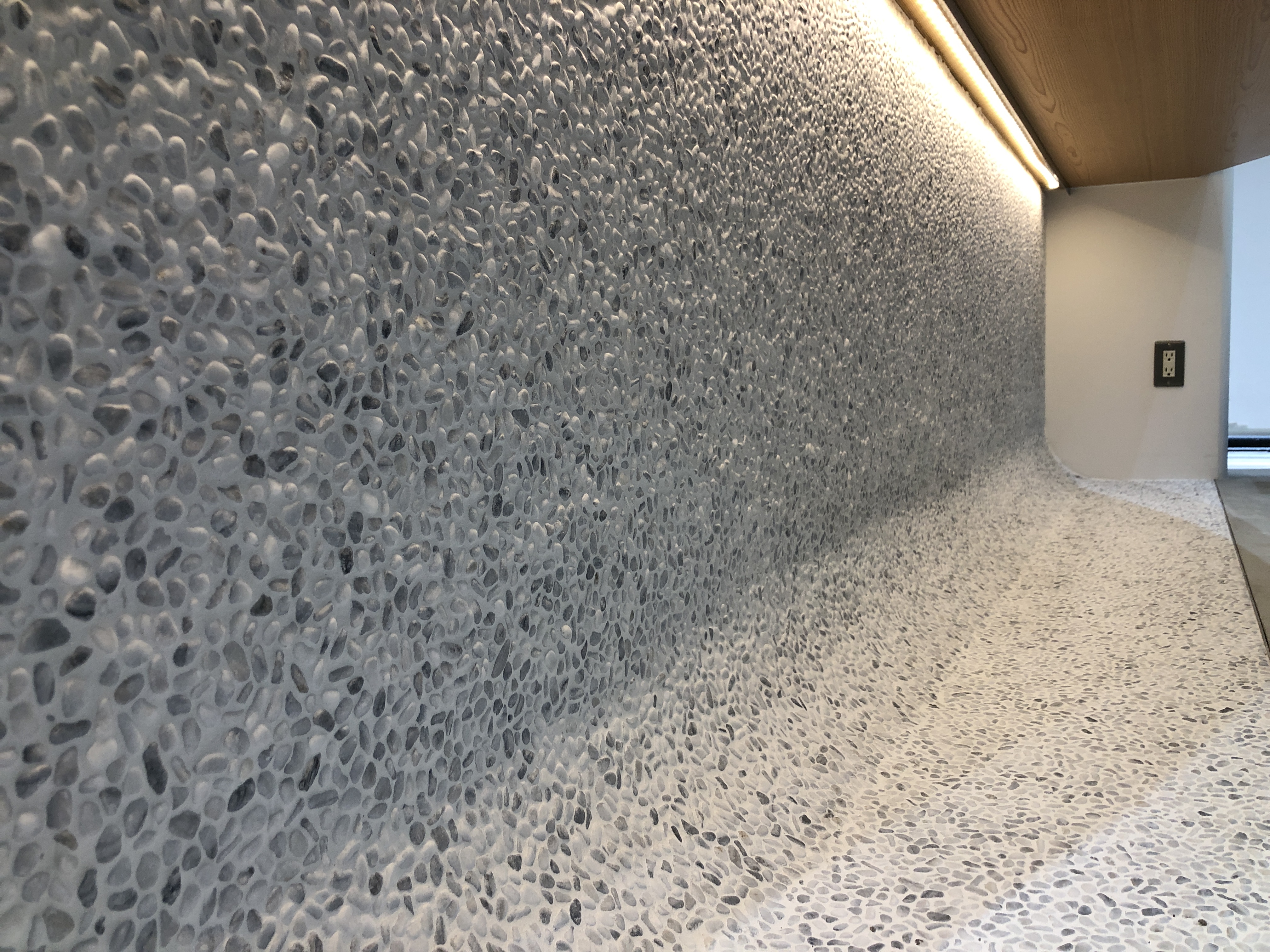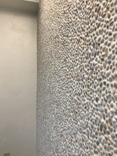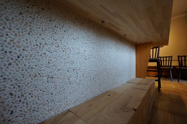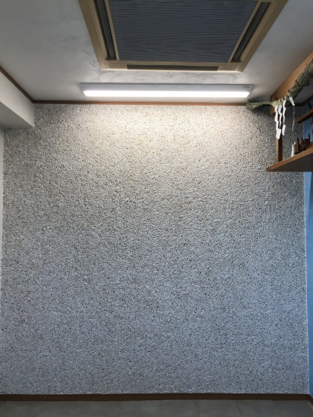 弊社会議室洗い出しネットストーン施工完了 このようにカラフルな石を使うとポップな印象の壁になります。tokyoplasterdecoratortaiwan左官原田左官左官ライブラリー千駄木洗い出しシート洗い出し仕上げ内装デザイン。