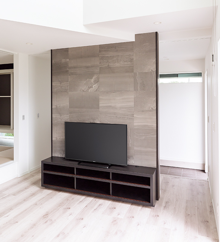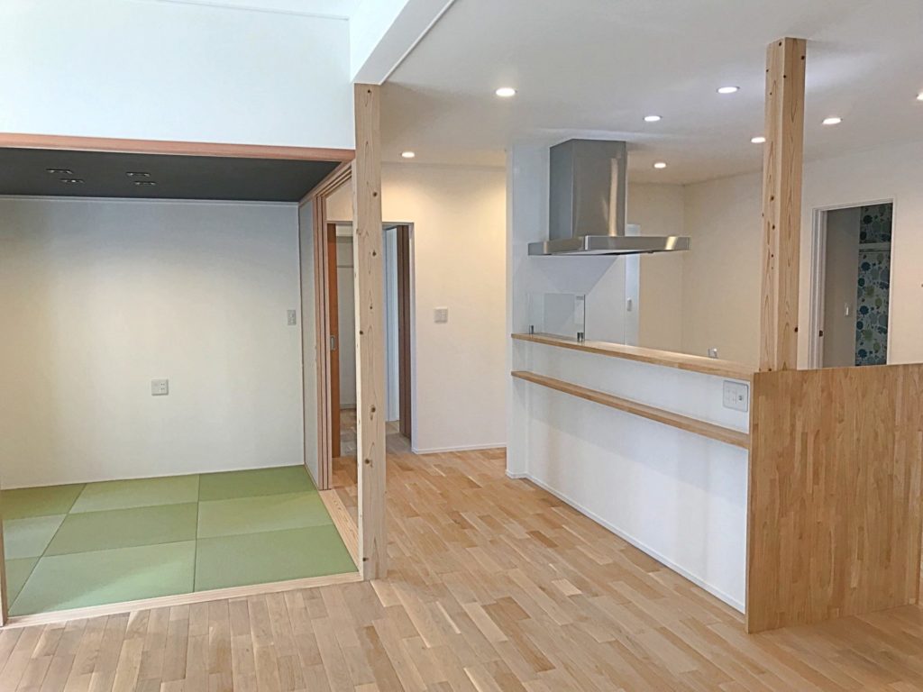 和室とリビングを仕切る建具は3枚の引き戸が壁に収まるタイプ。全開にすることで空間を広く感じられる くふうイエタテ。