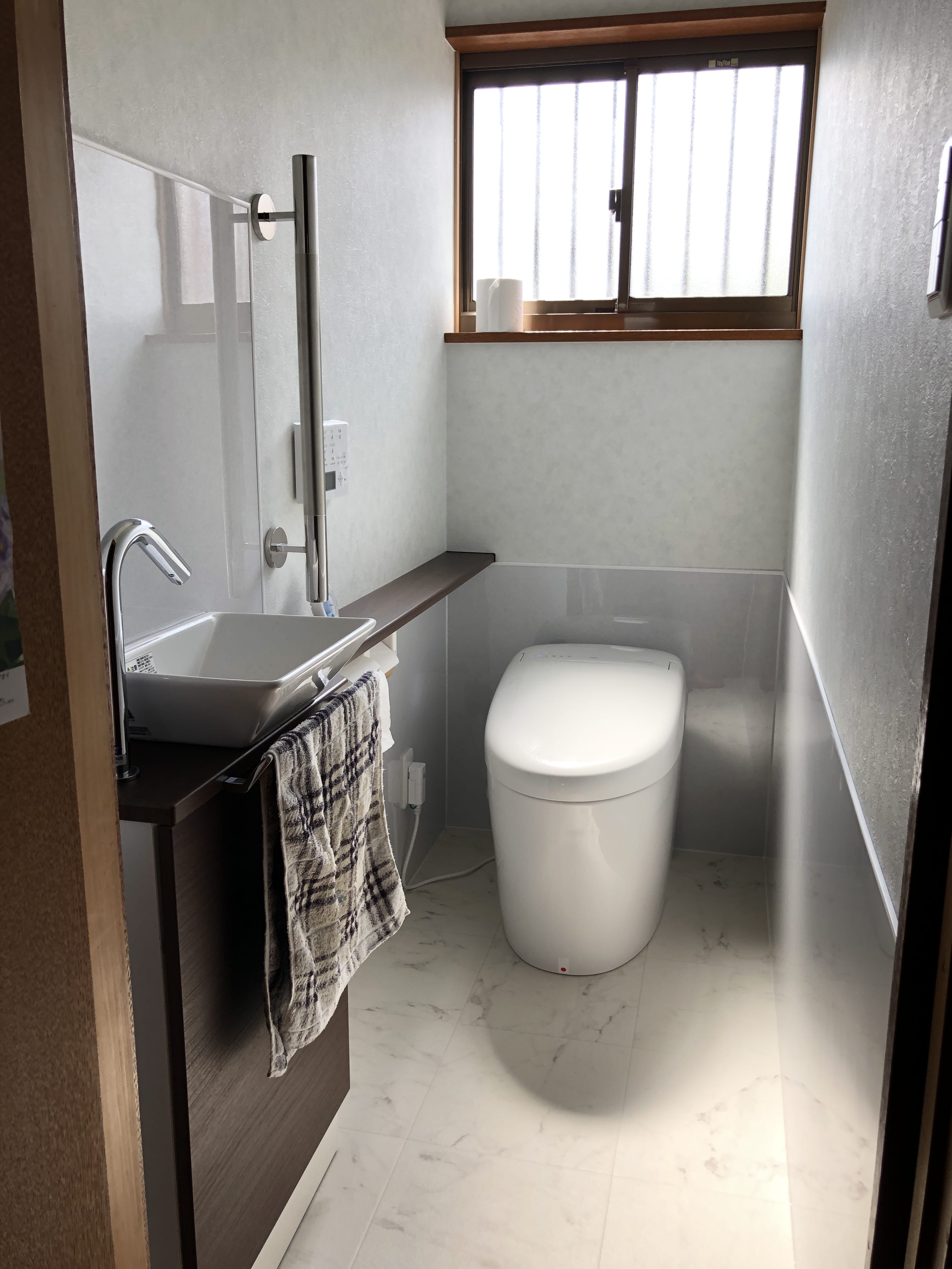腰壁にキッチンパネルを使用して飛び跳ねに強いトイレリフォーム! TOTOネオレスト Suidobi株式会社 浜松市。