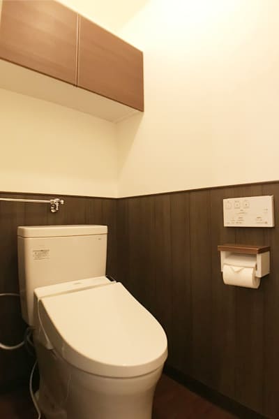 腰壁パネルがアクセント。収納スペースも確保した温かみのあるトイレ空間。