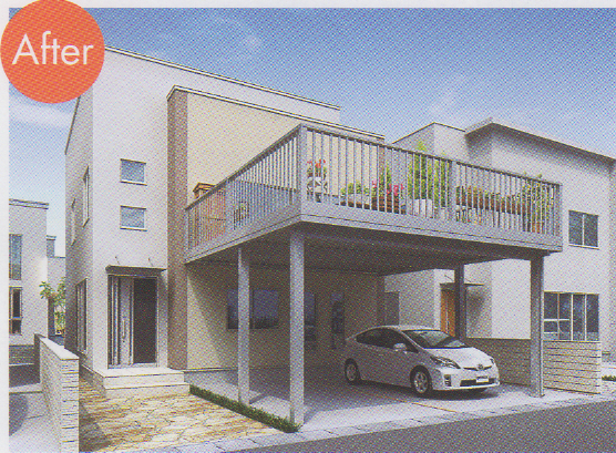 駐車場上のバルコニー。敷地の有効利用 グランフローア 三協アルミ – 山創建設株式会社横浜市の外構・エクステリア 設計・デザイン・施工着手金なしの安心外構YAMASO。