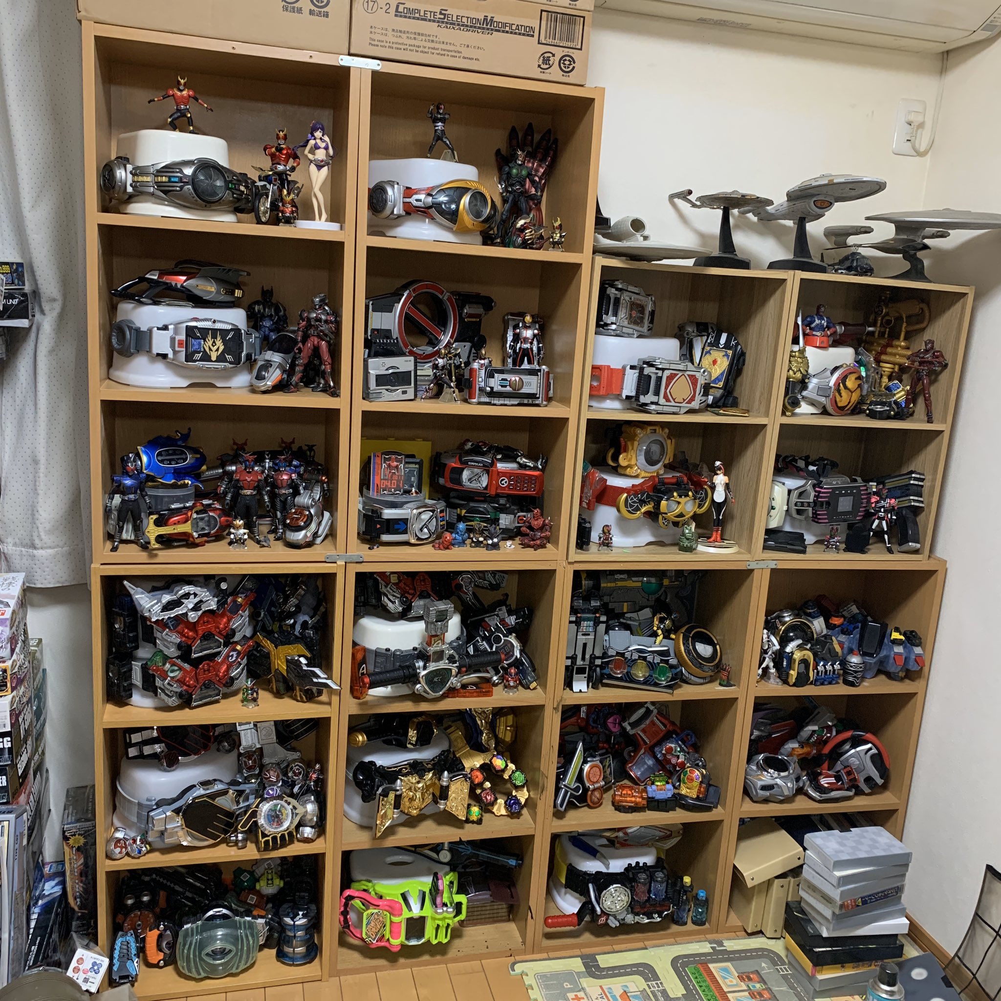 土屋シオン on X: "ちなみにこの黒い棚、ド◯キで1200円くらいなので、玩具、と言うか変身ベルト系のアイテムのディスプレイにおススメ。カラーボックスよりコスパいいです。けど、布を張るタイプなのでフィギュアの陳列には向かない。ベルトとか、箱モノとかにおススメ。