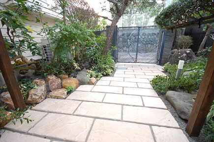 和風坪庭と洋風スモールガーデンの共存風景-世田谷区K様邸小さな庭や坪庭の施工例,アプローチガーデン・スモールガーデン千葉県 東京都の造園植栽 庭施工造園業専門店 新美園。