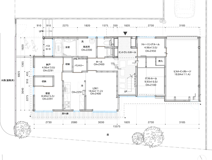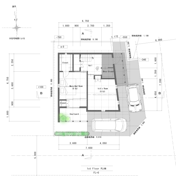 生垣の中の家 plan detail drawing . 愛知県 住宅 混構造 木造+鉄骨造 2階建て 新築studiovelocity建築士事務所建築建築デザイン構造新築住宅擁壁中庭スケッチイラスト平面図自然木造鉄骨造建築家とつくる家注文住宅。