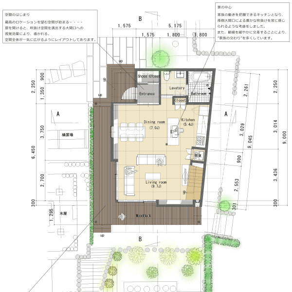 倉敷玉島リビングキッチンの家 平面図 - 岡山 住宅・建築の設計 建築家ー宇川建築計画事務所。