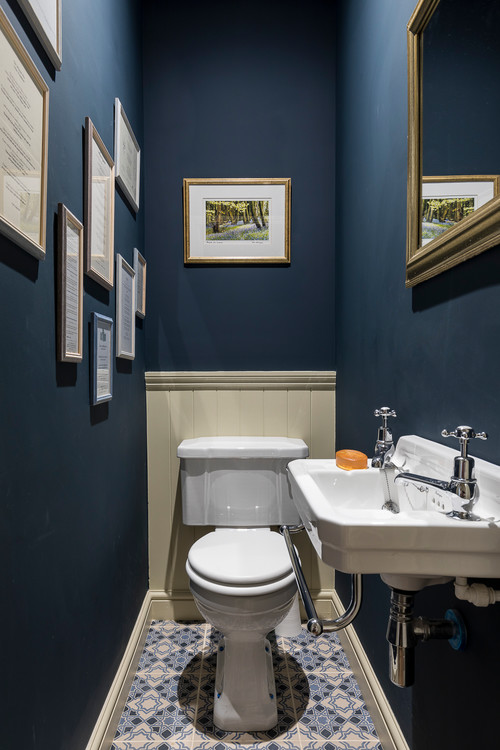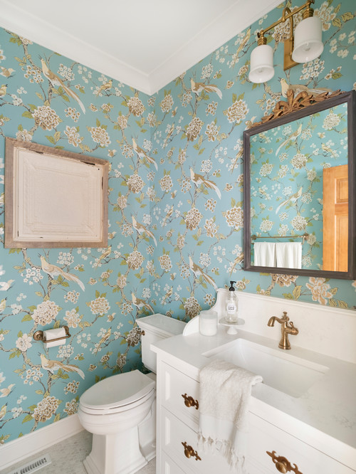 スウェーデンホームジャパン - ブルーベースの花柄トイレでスタイリッシュな仕上がり。Stylish finish with blue basefloral toilet.https:www.sweden-home.jp work nu_style nu_style_02トイレrestroom花柄壁紙floral北欧注文住宅スウェーデン。