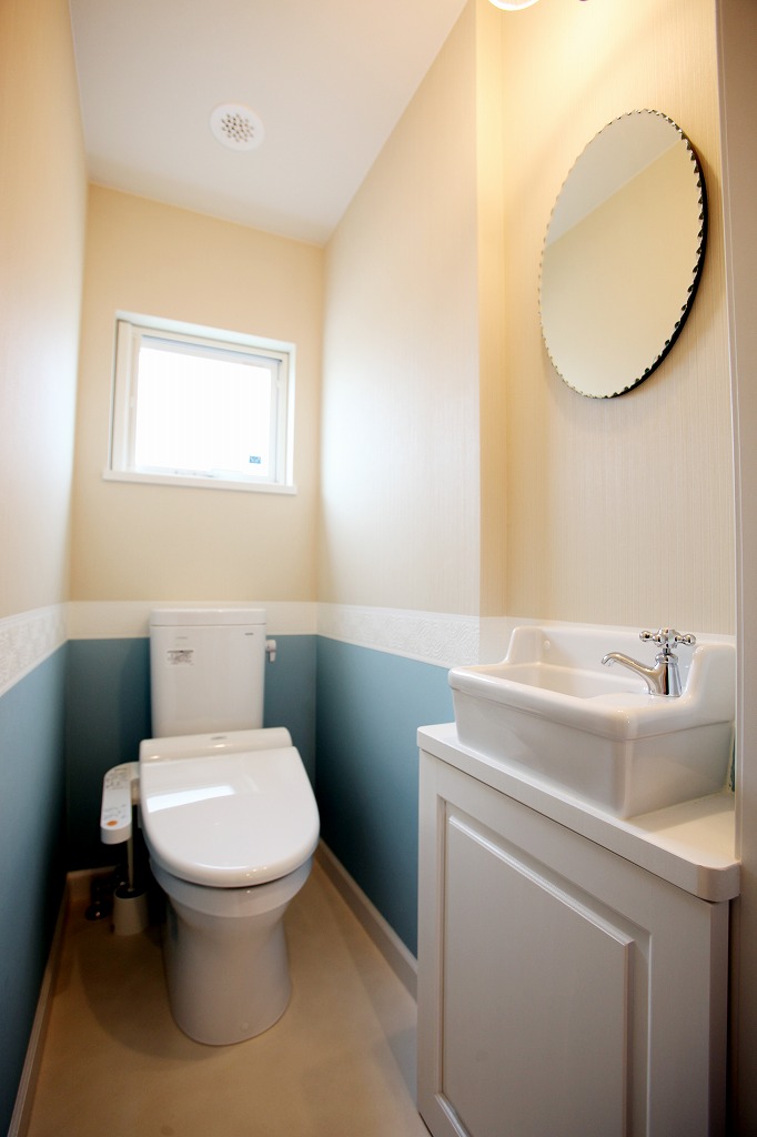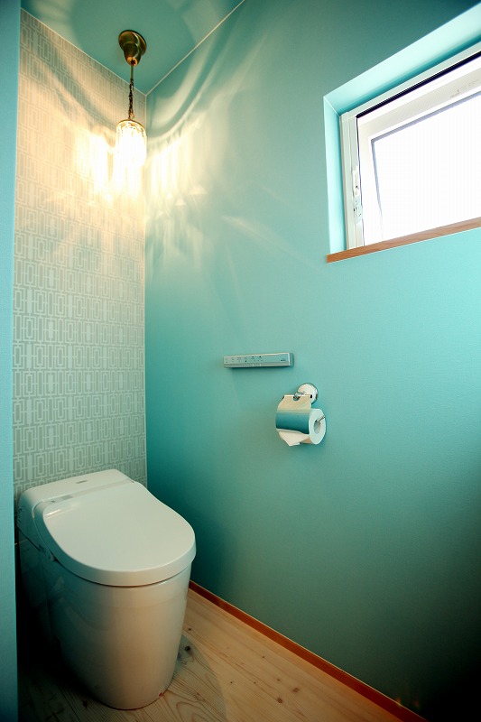 トイレの壁紙 水色がアクセント編 -香川-高松・丸亀の高性能注文住宅・リノベ-「佐藤の窓」のパッシオパッシブ。