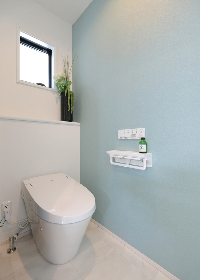トイレは白×水色のアクセントクロスでさわやかにコーディネート くふうイエタテ。