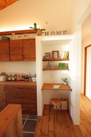 キッチン横に1帖の書斎コーナー📖 在宅ワークスペースとして✨ デスクの両側に設けた可動棚には書類等をたっぷり収納できます。 リビング側からは見えないところもポイントです💡福工房木の家土間桧無垢の木インテリア家homeinterior新築。