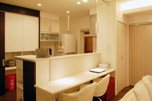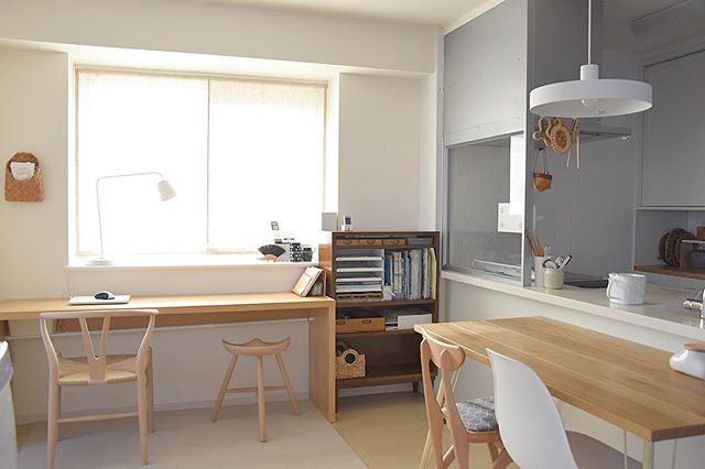 リビングには奥様念願のミシンを置く作業スペースを設け、ご主人もパソコン作業ができるL型のカウンターデスクを造作。腰壁をつくることで集中できるよう視線を遮りながら、元サンルームから陽の入る、圧迫感のないワークスペースになりました。 ーーー 『都筑 I邸。