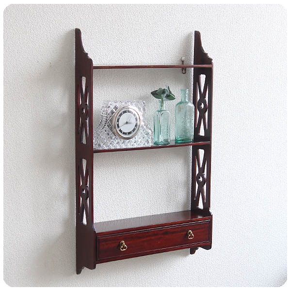 イギリス アンティーク調 ウォールシェルフ 壁掛け棚 マホガニー ドロワー ラック インテリア 家具 K-286。