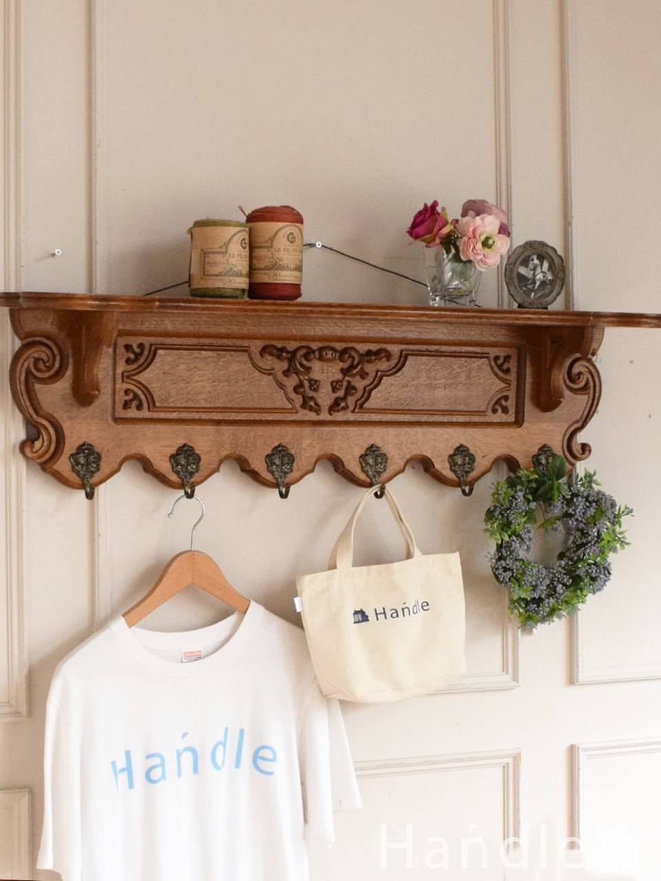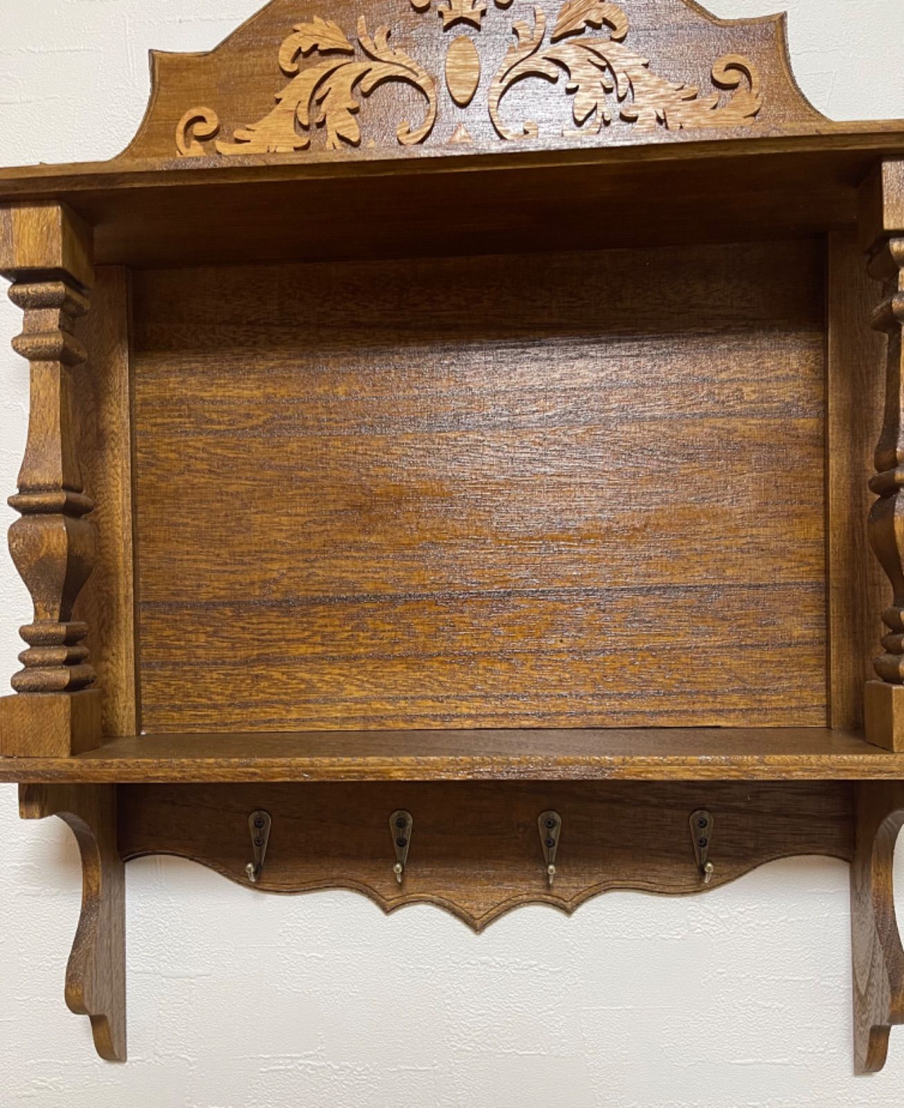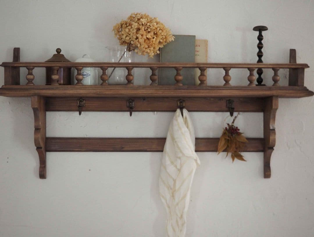 ✨古材を使ったオシャレなアンティークウォールシェルフ✨ アンティーク家具 イギリスアンティーク オーク材上品なデザインのフック付きウォールシェルフ ウォールラック、壁掛け棚ラフジュ工房。