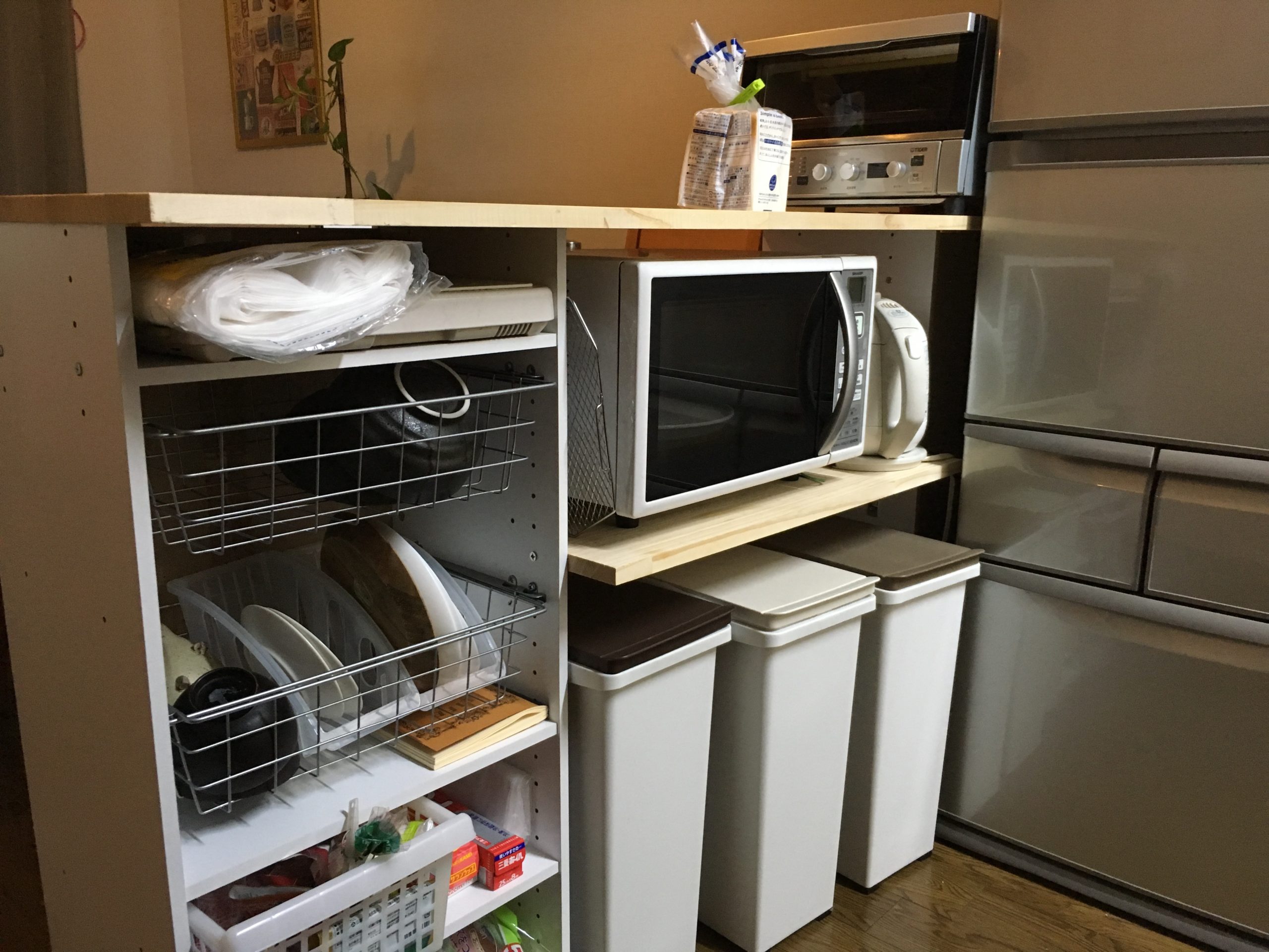 キッチンDIY 3段カラーボックスを流用して電子レンジが収まるキッチンカウンターを自作 料理用の作業台 じゅんいっちゃんねる。