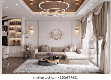 ベージュのソファ、コーヒーテーブル、金色のアクセントが施された白い壁のあるトレンディでスタイリッシュなインテリアリビングルーム」のイラスト素材2506999631Shutterstock。