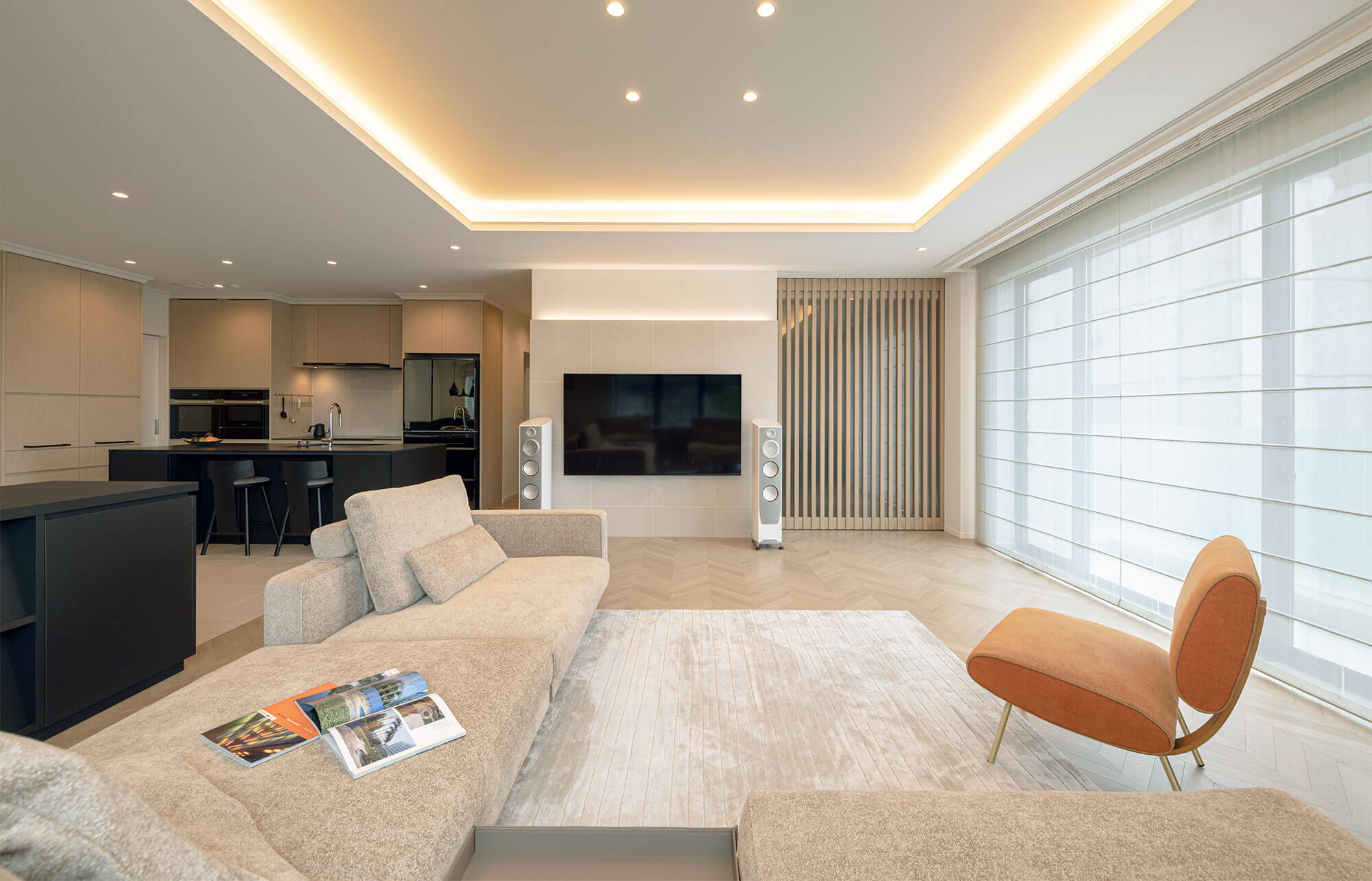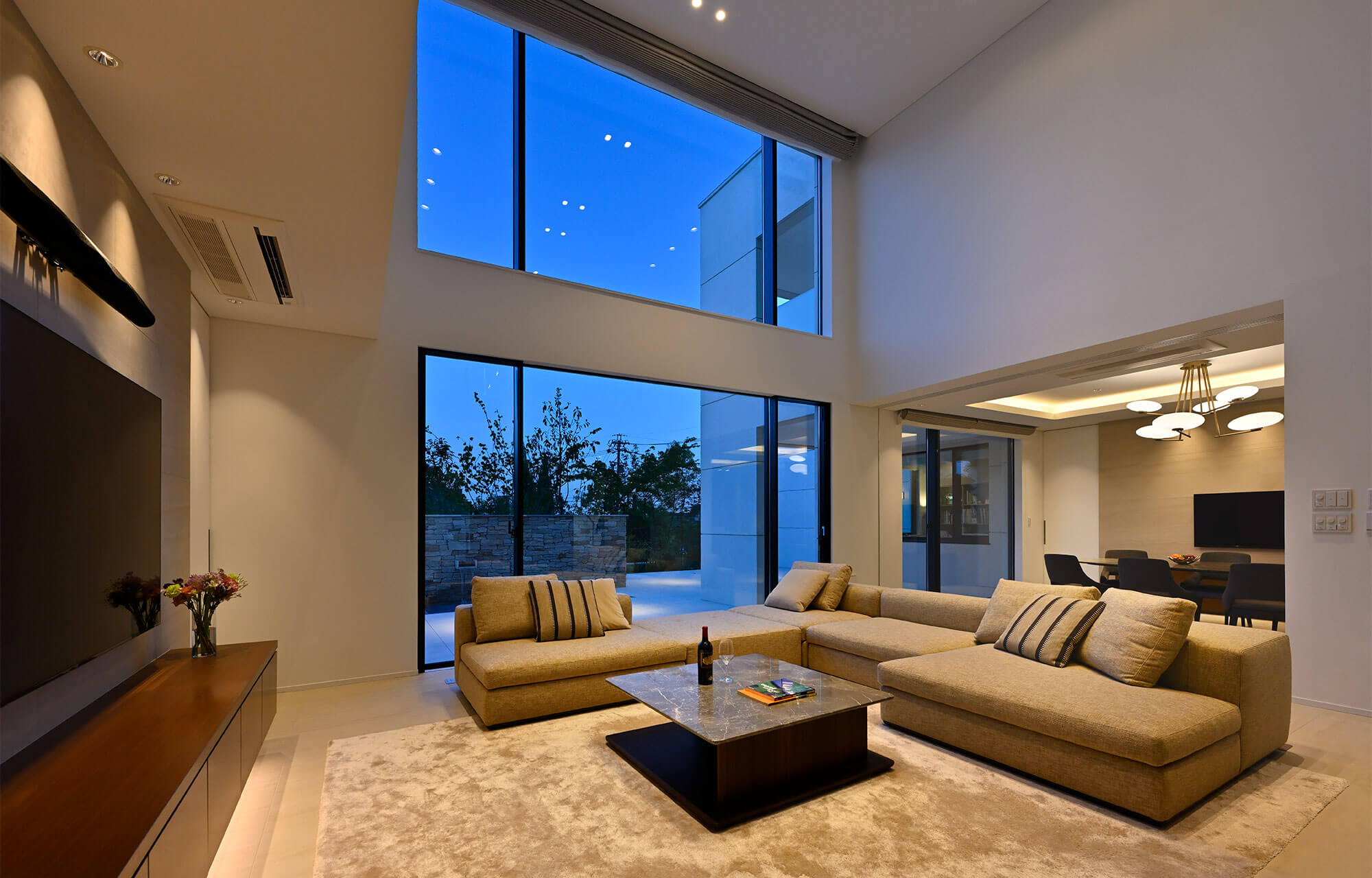 白×ベージュで自然光を大切にする20畳モダンリビングインテリアカヴァースインテリア。