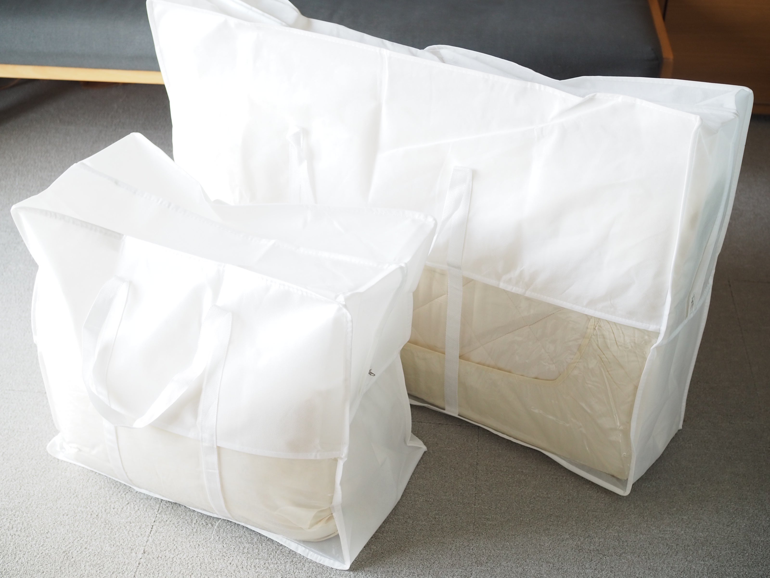 変えて良かった、布団収納 3COINS クリアボックスバッグ大活躍。 : Happy Living -削ぎ家事研究室。
