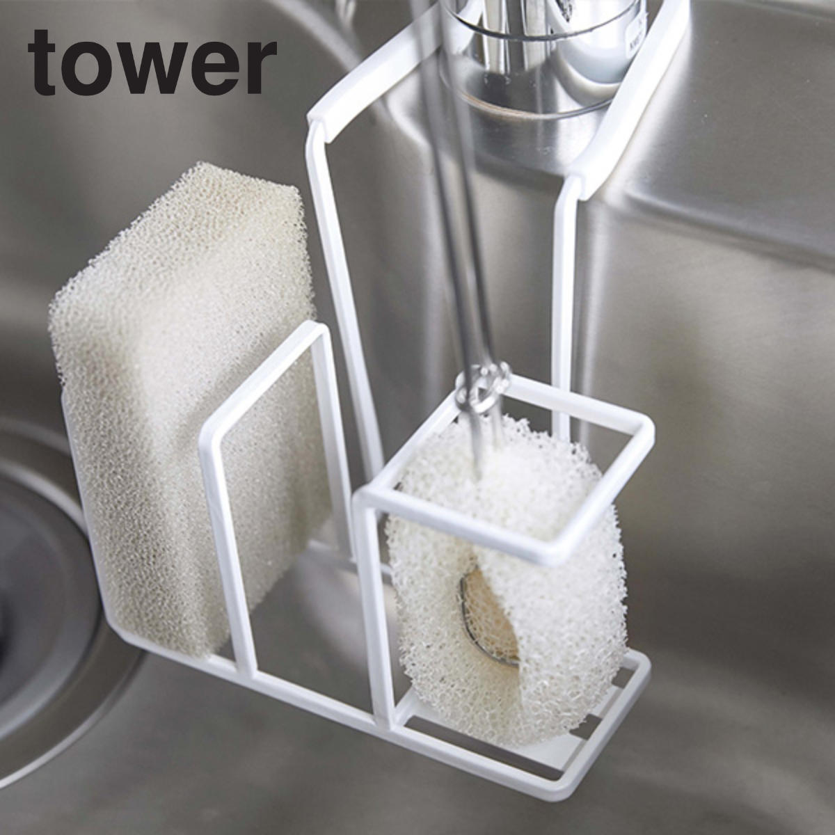 dショッピング 山崎実業 tower 蛇口にかけるスポンジ&ブラシホルダー タワータワーシリーズ スポンジホルダー 蛇口にかける スポンジ& ブラシホルダー スポンジラック スポンジ入れ スポンジ置き スポンジ収納 ボトルブラシホワイトカテゴリ:キッチン。