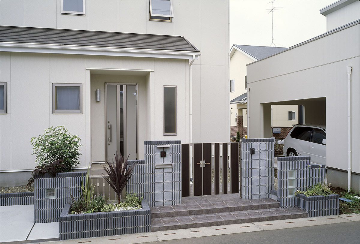 玄関周りを花壇で彩り、勾配の大きな敷地を使いやすくしたプラン福岡工業入間・所沢・狭山の外構・エクステリア。