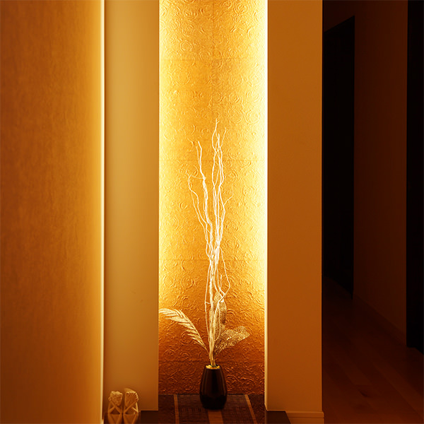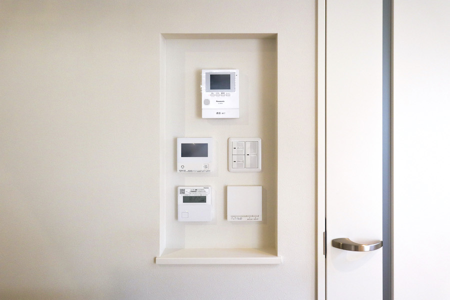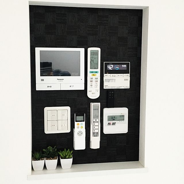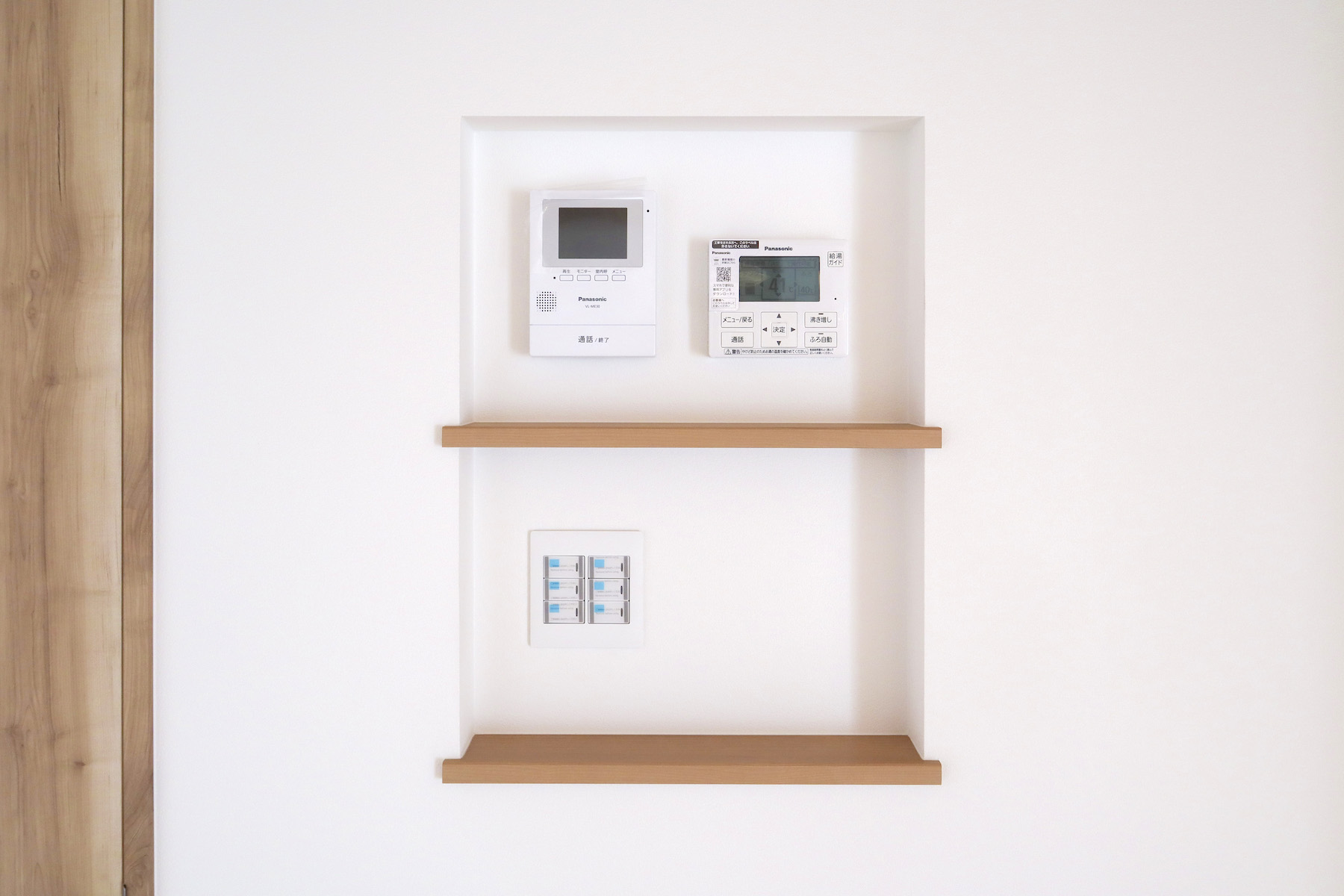 インターホンや給湯器、床暖房、エアコンのリモコンをニッチにひとまとめに。 壁から数センチの飛び出しがないだけで、とてもスッキリとして見えます。 また、 ニッチの中をアクセントクロスにしてもオシャレ。 マグネット仕様にしたり、飾り棚・マガジンラックを併用する。