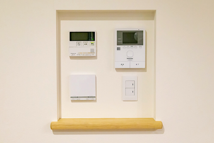 木造注文住宅照明給湯インターホンスイッチをキッチンリビング壁ニッチに集約設置北島建築設計事務所。