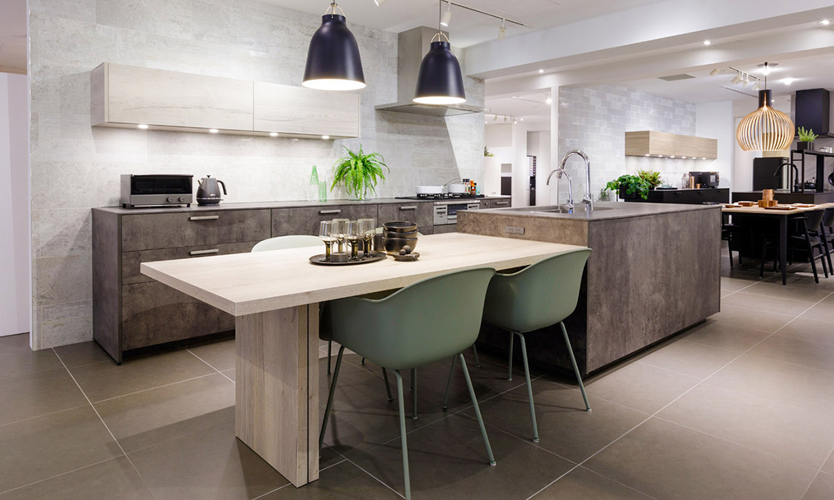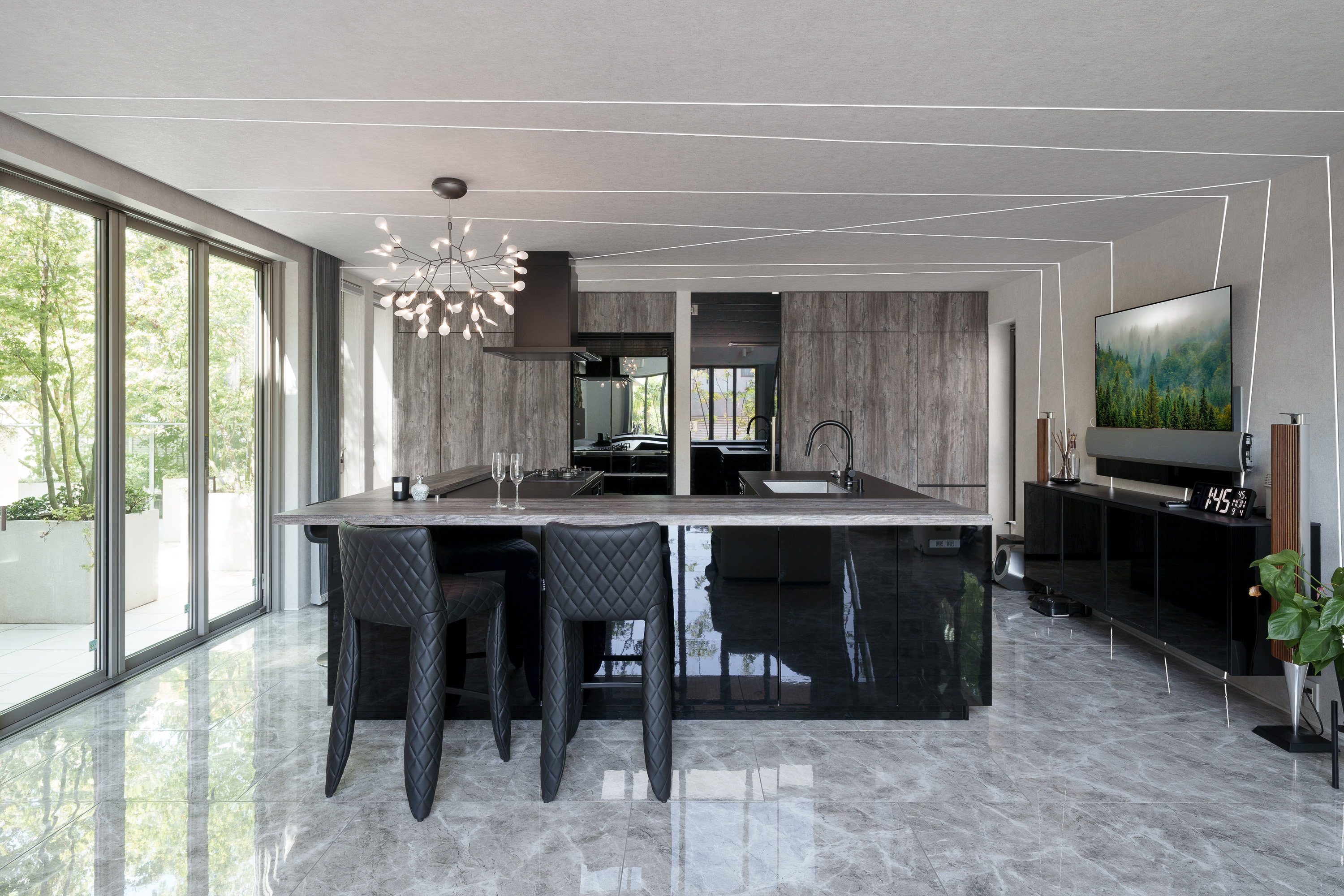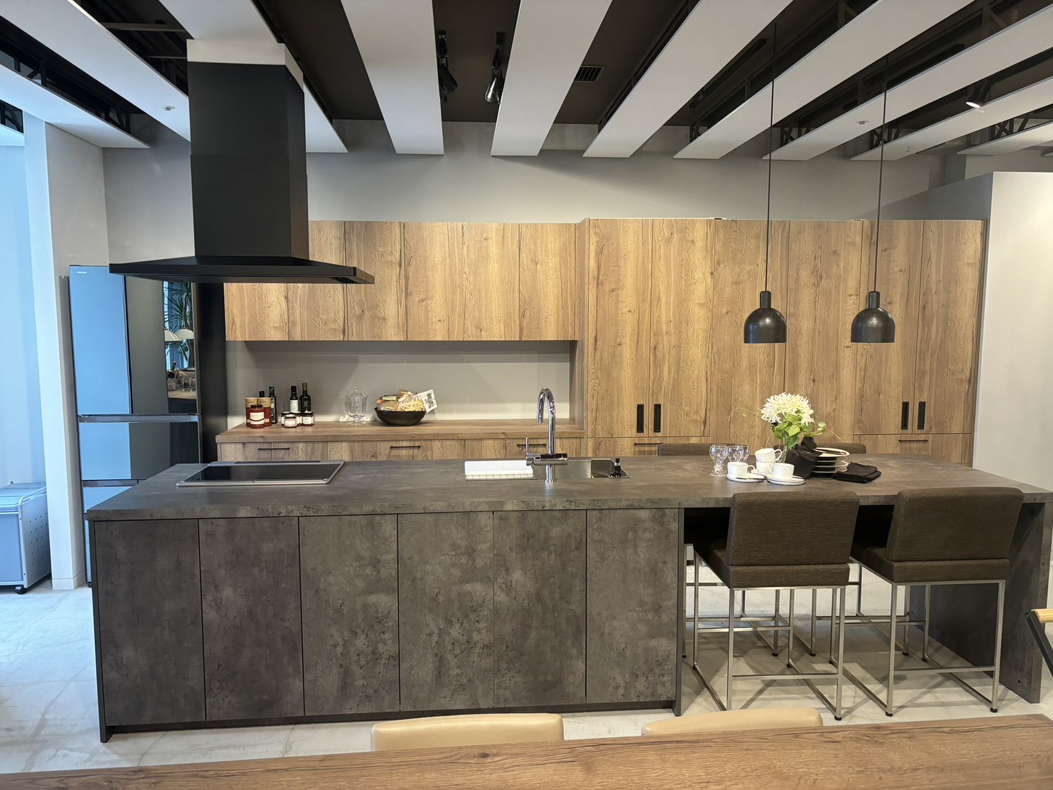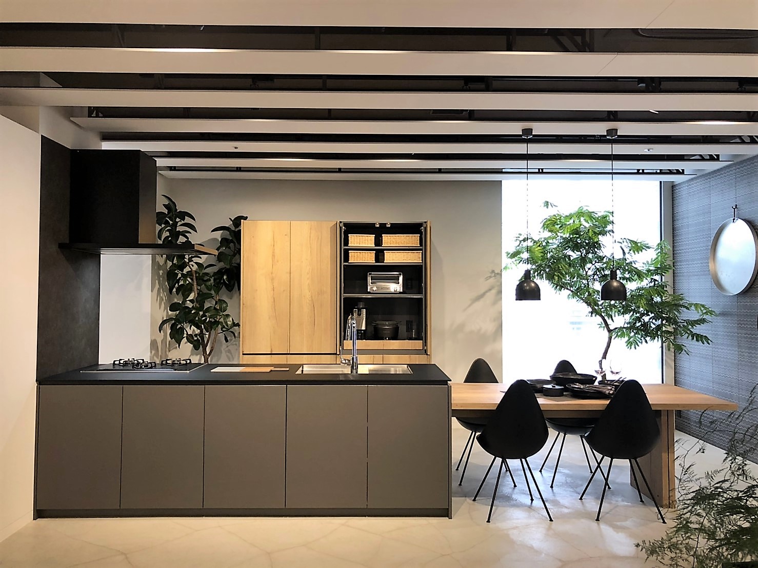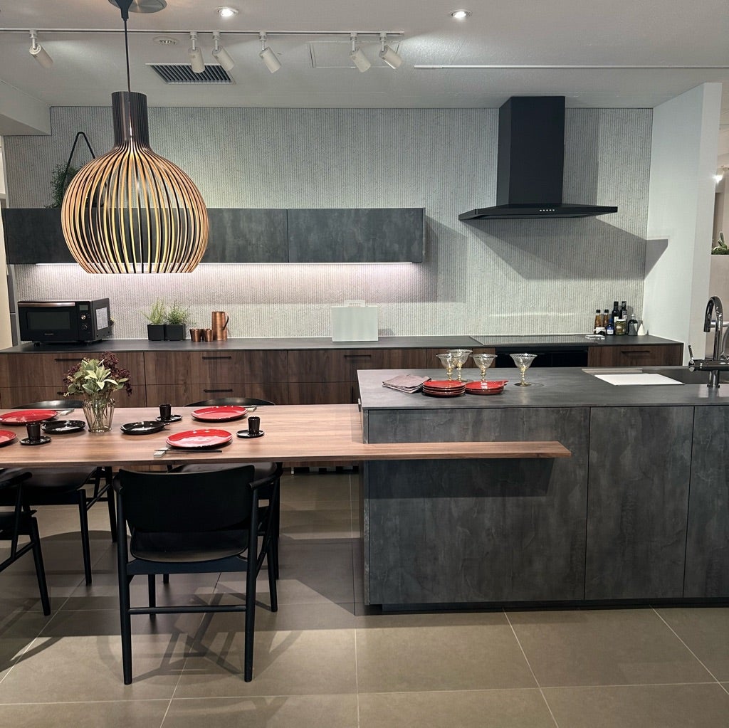 ショールーム展示のご紹介陶器のような質感で今キッチンハウスで最も人気のある「メルクリオ」をベースとしたキッチン空間。一見重厚な印象ですが、吊り戸とテーブル天板にアッシュベージュカラーを、そして丸みのある木製ランプシェードを添えることで、抜け感を。