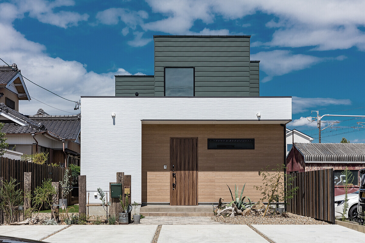 片流れの屋根に箱を組み合わせた外観デザイン。モスグリーンの横葺きガルバリウムに木目のサイディングがアクセントに。土地探しから建築家がサポート。