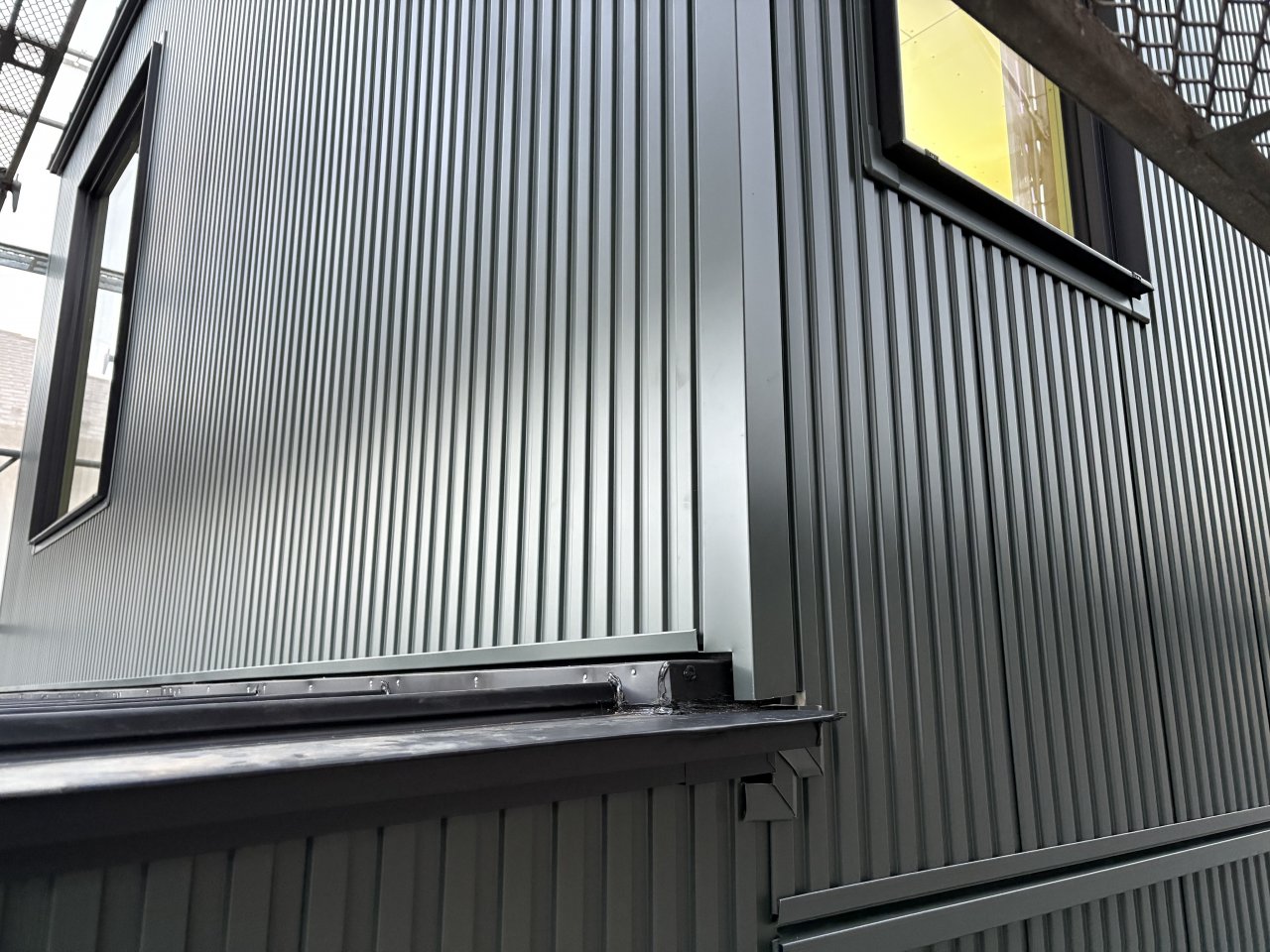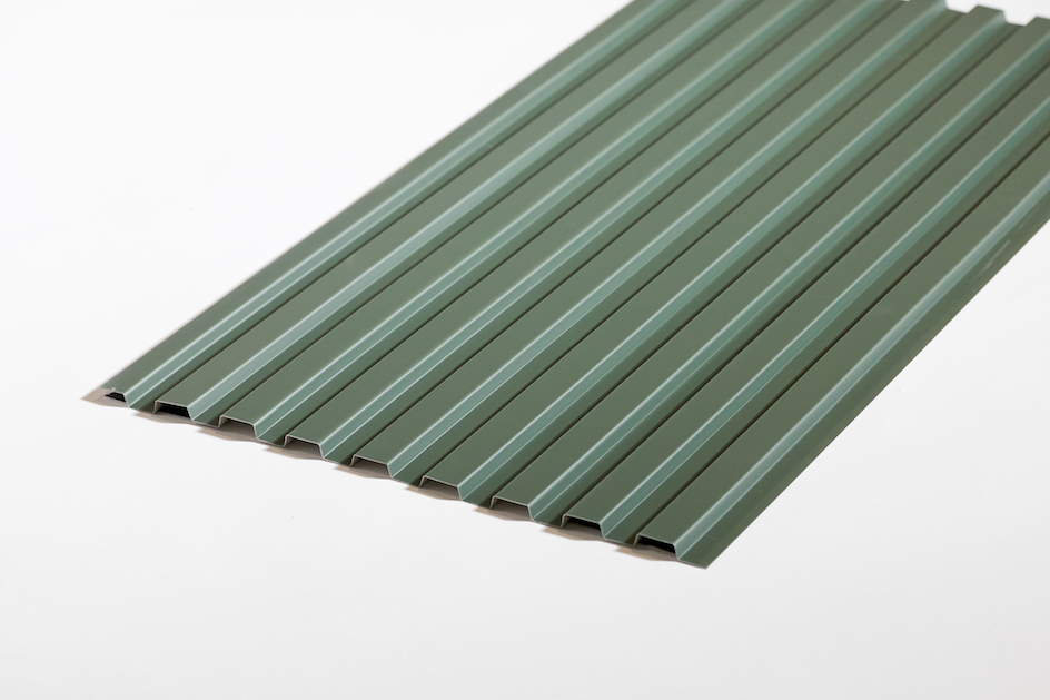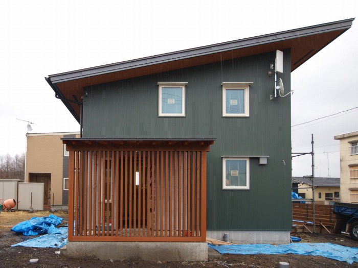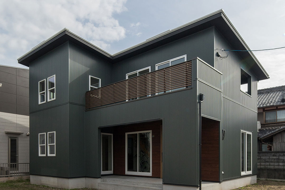 外壁はモスグリーン色のガルバニウム鋼板。基礎から軒天までの1枚貼りで施工しているため綺麗な仕上がりに くふうイエタテ。