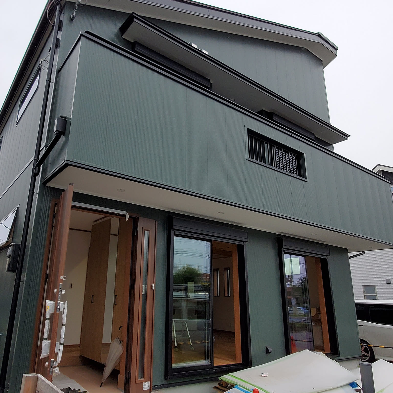 我孫子市で新築!モスグリーンのガルバリウム鋼板と中間水切りの外壁デザイン 2024.12.11倉光は新築の外壁工事・サイディング・塗装、屋根 板金・雨樋工事からリフォームまで。