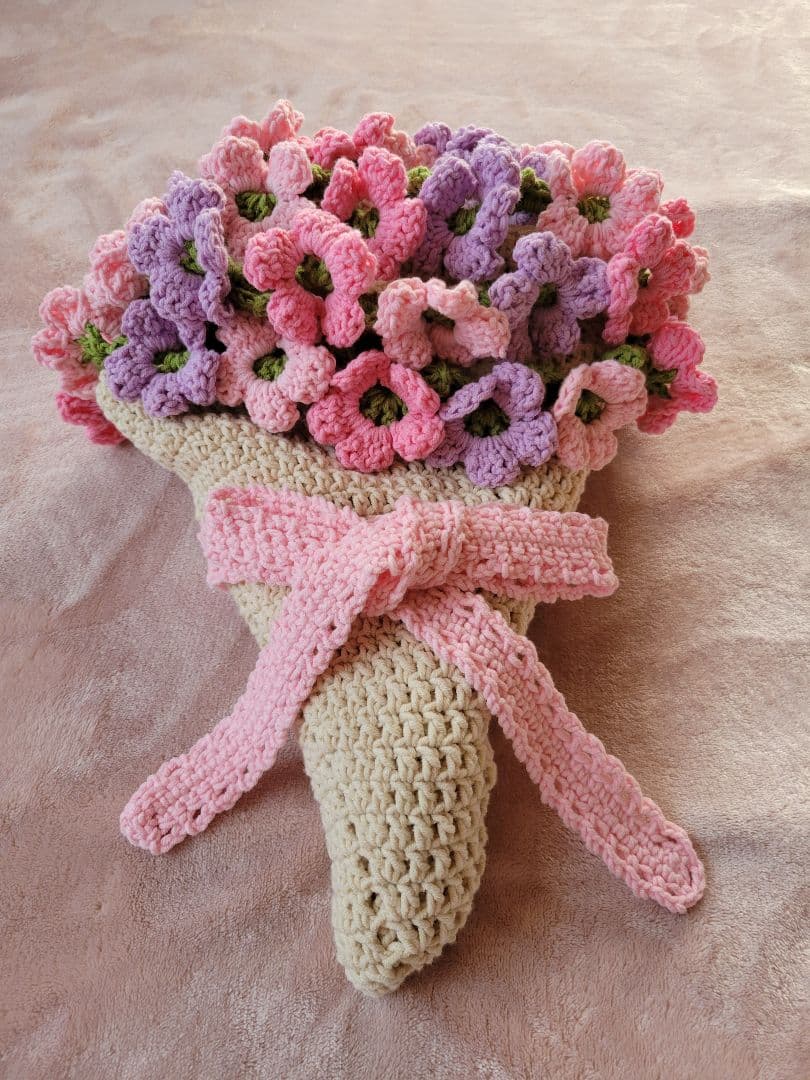 手編み 花束ブランケット 花束ブランケット ブーケブランケット ピンク 編み物 毛糸 かぎ針編み。