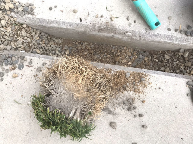 駐車場:コンクリート目地のタマリュウの手入れ - ちょっと曲がった家。