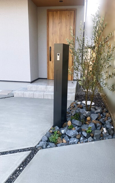 新築外構>化粧砂利の目地でアクセント。駐車場の土間コン打設 佐伯市 M様邸佐伯市のエクステリア・外構・お家の工事のお店Sunny SideTerraceエクステリア・プロ佐伯店。
