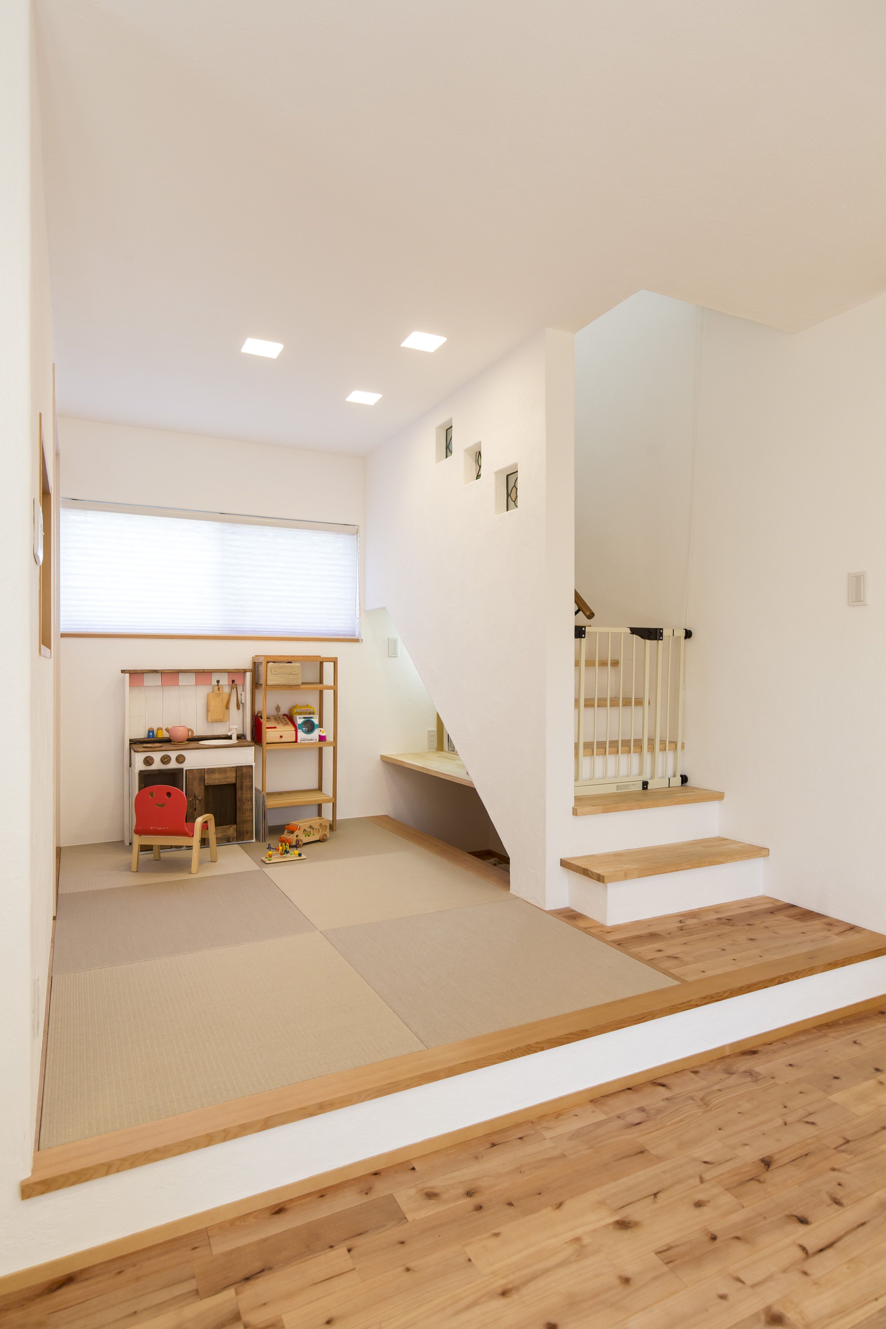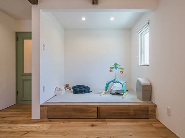 約2畳の小上がりは、子どもがおもちゃを広げて遊べる場所。階段下のヌックはおもちゃを片付ける定位置になっている。子どもが大きくなったら書斎に使。