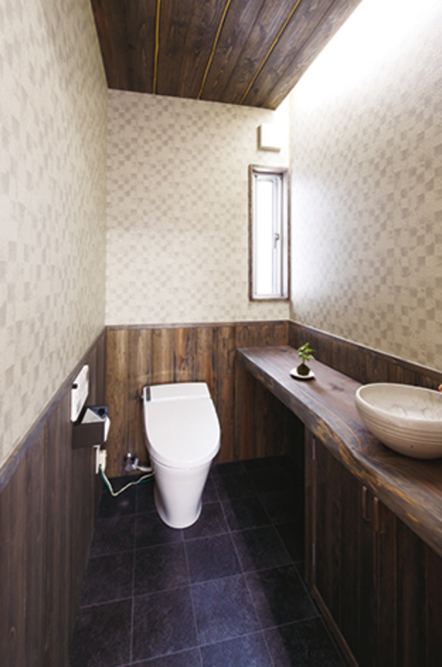 和風居酒屋風のトイレ。着色したスギ材を使って和モダンな雰囲気を演出 くふうイエタテ。
