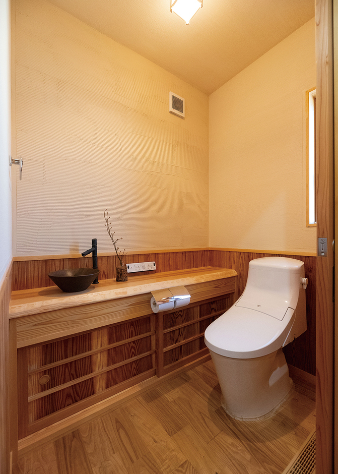 こだわりの和風トイレ網代天井にじゅらく壁。 檜のカウンターには、備前焼の手洗鉢をはめ込んでいます。水栓は竹筒をイメージしたデザインで、タオル掛けもオリジナルの竹製てす。 こだわりのトイレは、癒やしのプライベート空間。高橋建築岡山木造住宅岡山注文。