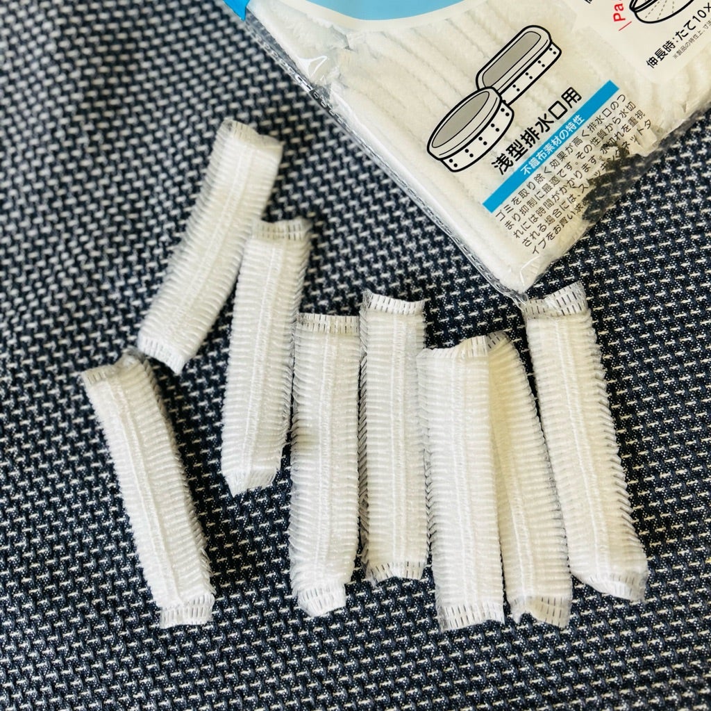 セリアの『不織布水切りフィルター浅型排水口用55枚』がコンパクトなスティック。