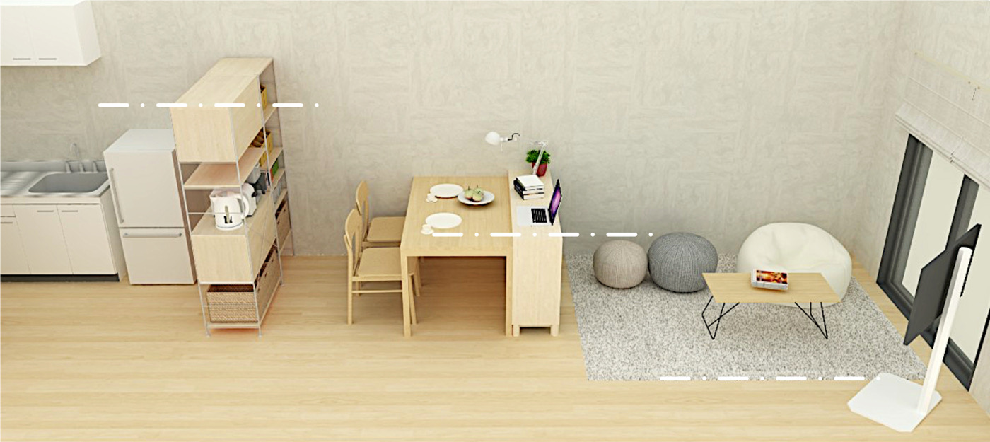 10畳・壁付けキッチンのLDK、収納と間仕切りを考えた家具のレイアウト - RE -アールイ。