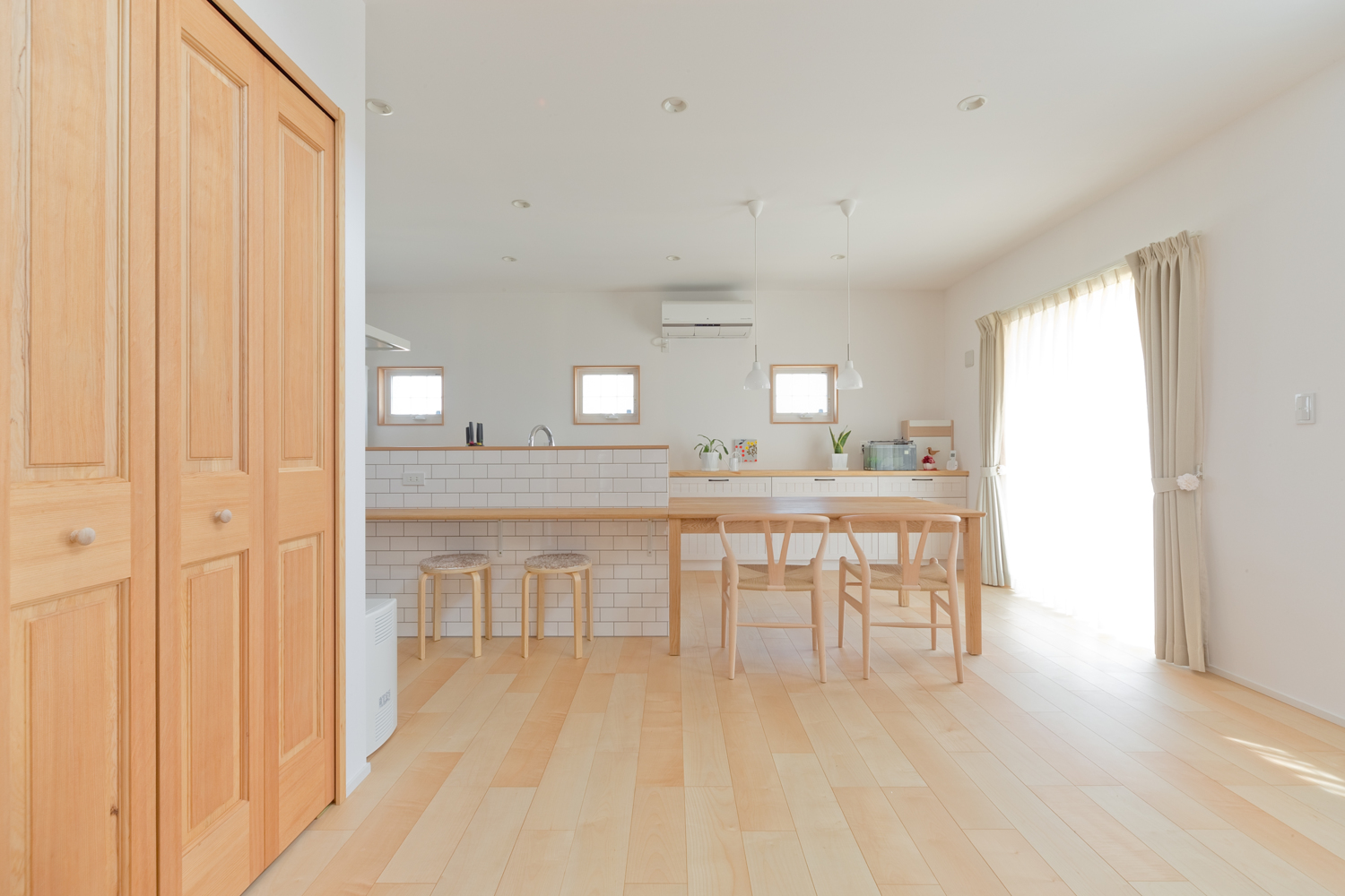 メープルの床と白いタイルが好印象 家事が楽しいアイランドキッチンの家 自然素材の注文住宅なら兵庫のMDホームズのフォトギャラリ。