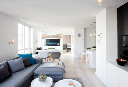 おしゃれなリビング磁器タイルの床、白い床のインテリア画像 75選 - 2025 年 10月Houzzハウズ。