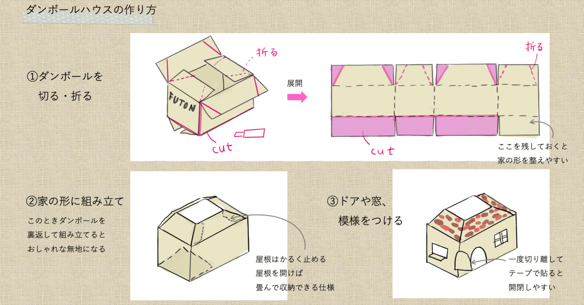 0円工作 1箱のみで出来るダンボールハウスを親子で作ろう!たためるので収納も楽々-あそびぎな。