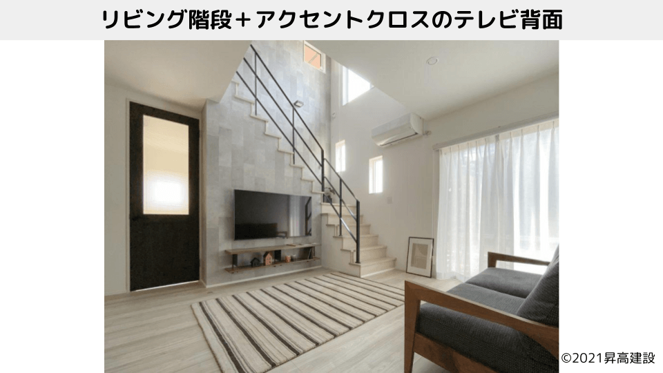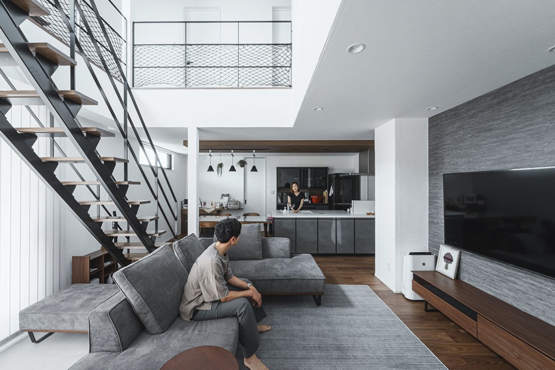 鉄骨階段とグレーのアクセントクロスが調和 くふうイエタテ。