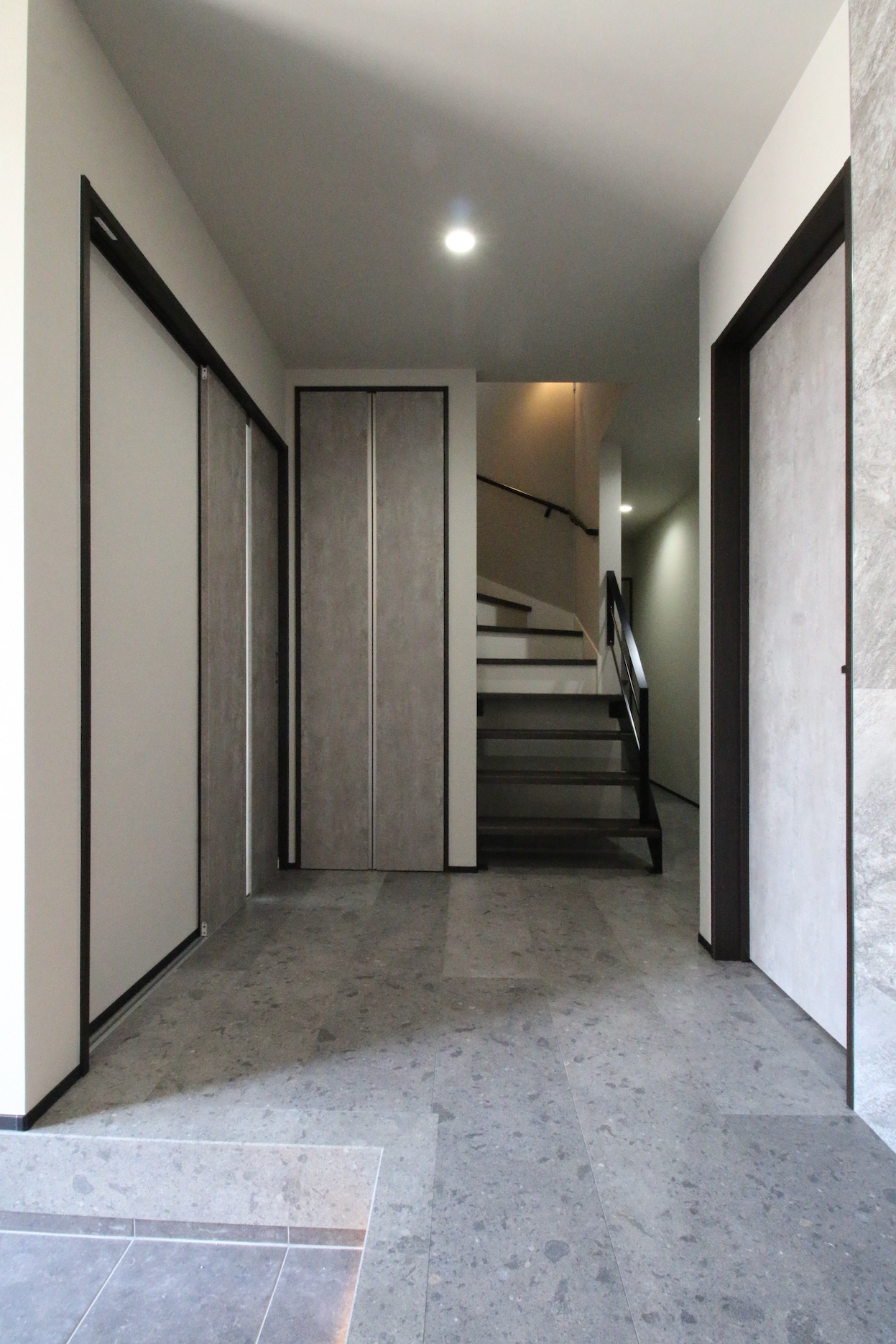 モダンな石目調の壁とスタイリッシュな黒い階段が映える玄関 - 事例写真「2階リビングの家」注文住宅のハウスネットギャラリ。