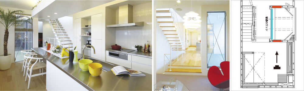 耐力壁を利用してアイランドキッチン風に。給湯のスイッチなどを来客から見えない壁面に取り付けた くふうイエタテ。