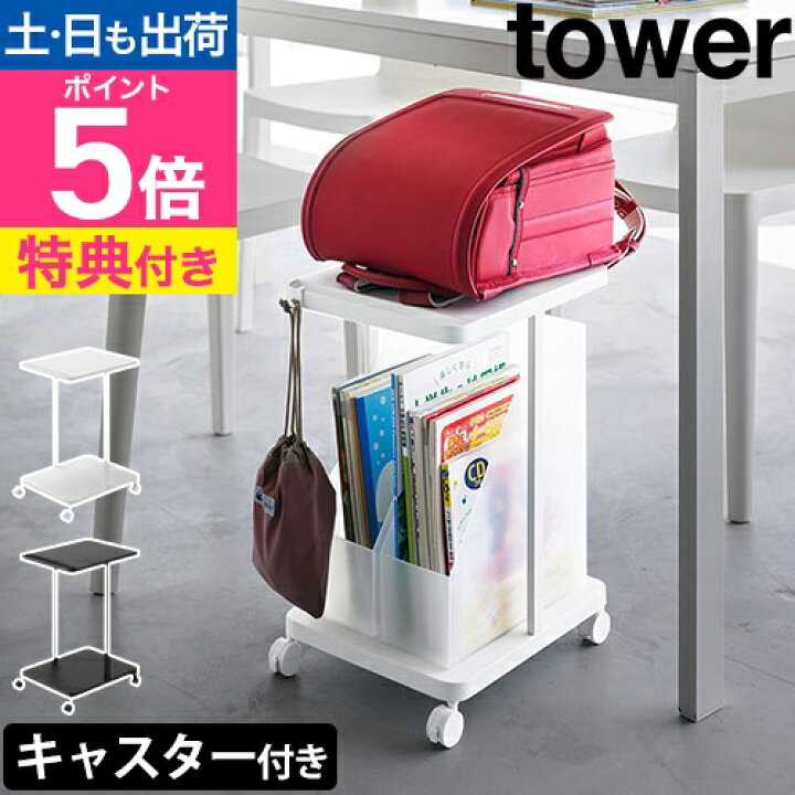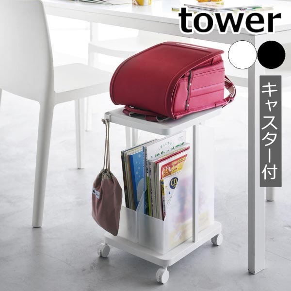 ランドセル収納ラック タワー キャスター付き 2段山崎実業 tower フック付き ランドセルラック ワゴン リュック 子供部屋 リビングダイニング 収納雑貨 教科書 おしゃれ シンプル yamazaki 公式 モノトーン 黒 白 ブラック ホワイト 1747 1748 57-174シリーズ別。