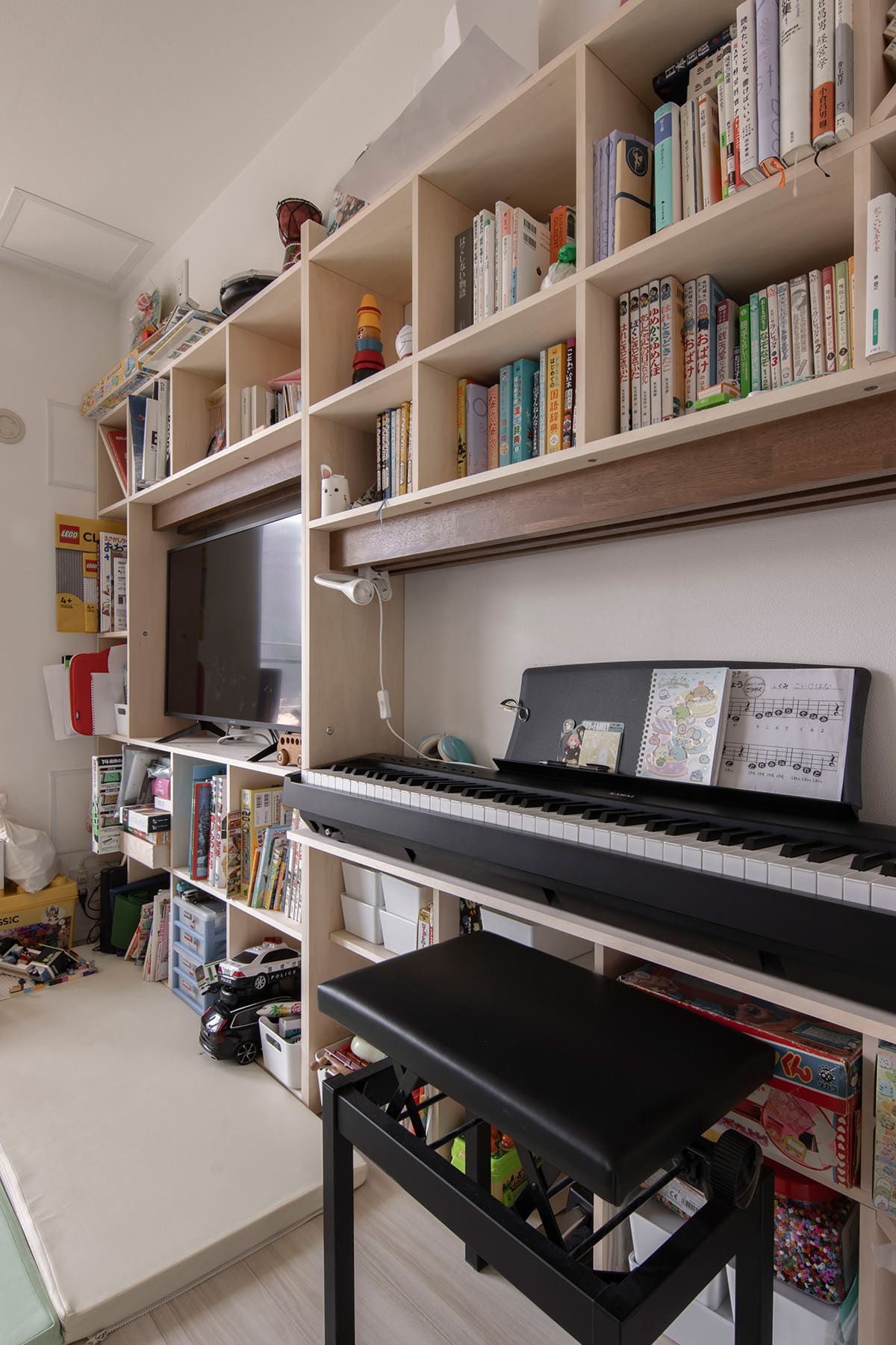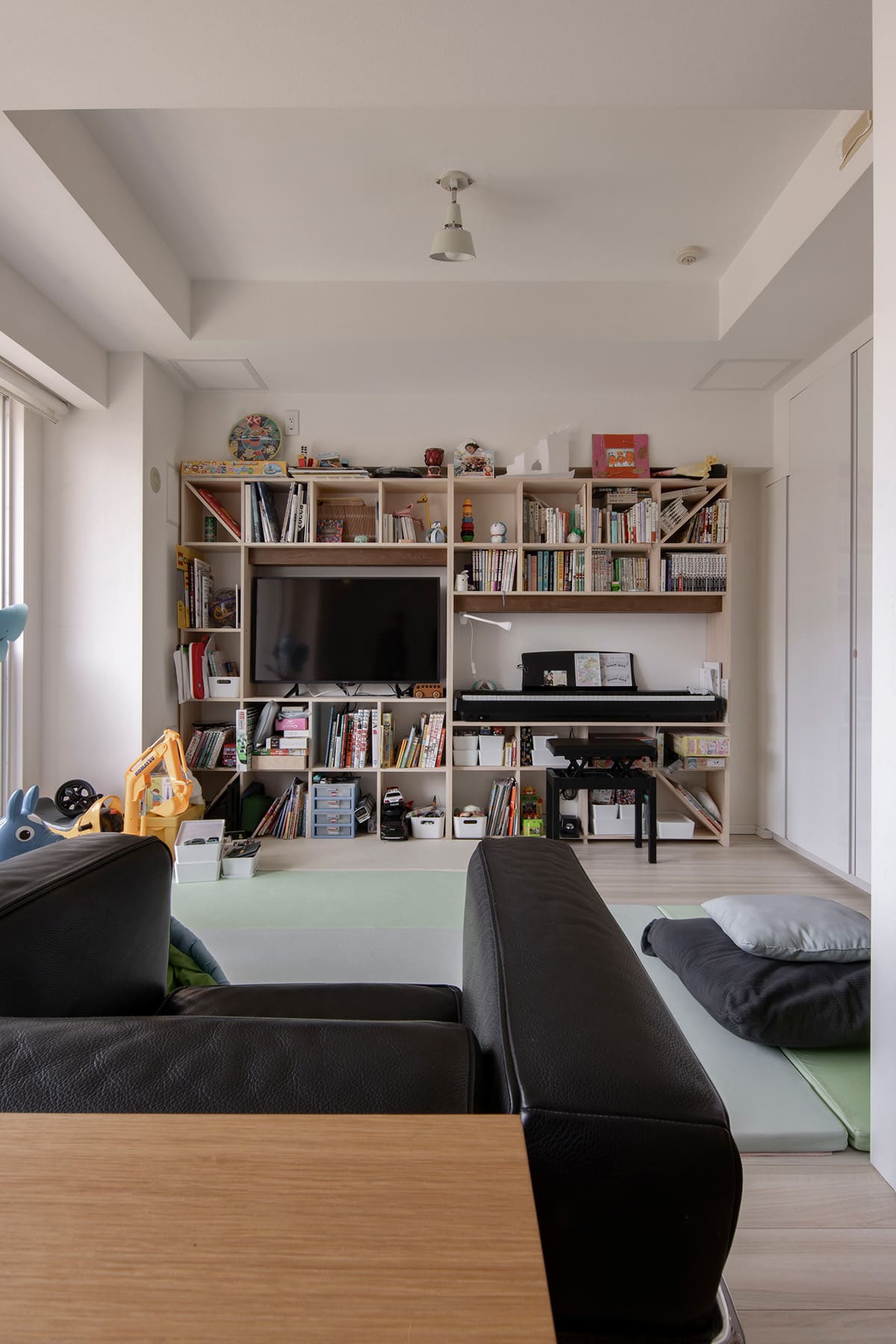 TVも電子ピアノも包み込む – Shelf 開口部のある本棚 – マルゲリータお客様事例。