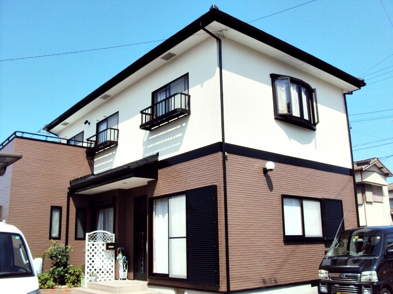 ブラウン×アイボリーのツートンカラーでお洒落な外観になりました♪建都リフォーム富士市、富士宮市のリフォーム・増改築ならお任せ。